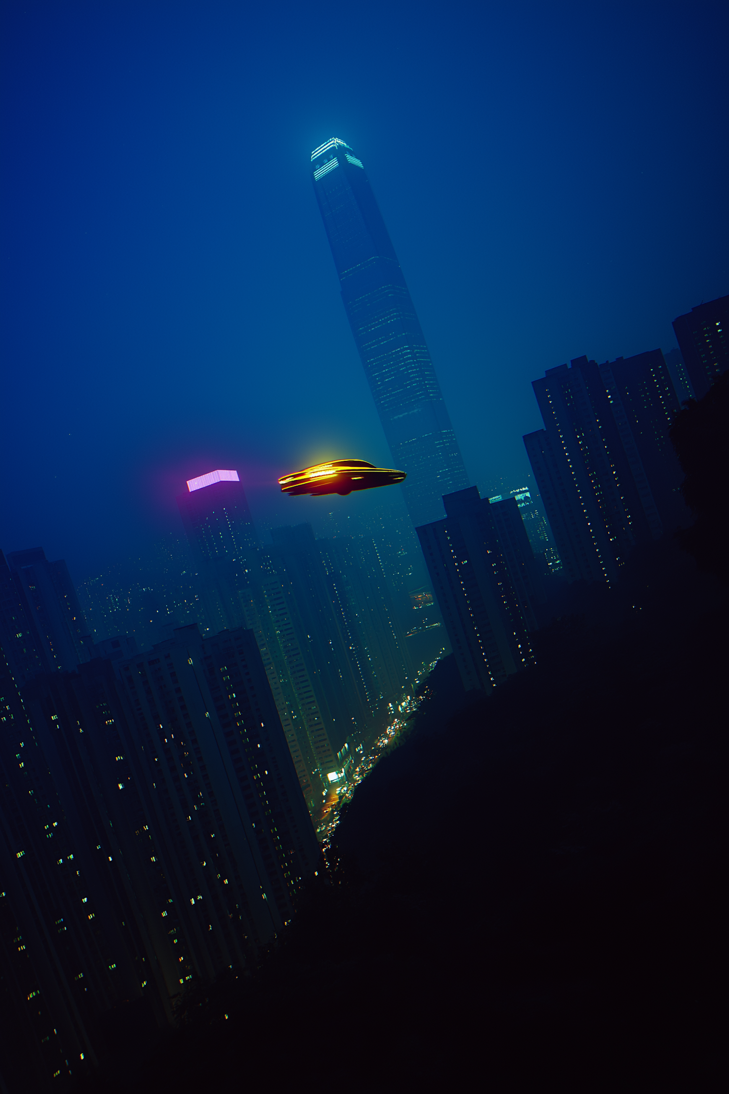 A glowing futuristic vehicle hovers over a cityscape at night, surrounded by illuminated skyscrapers and vibrant urban lights.