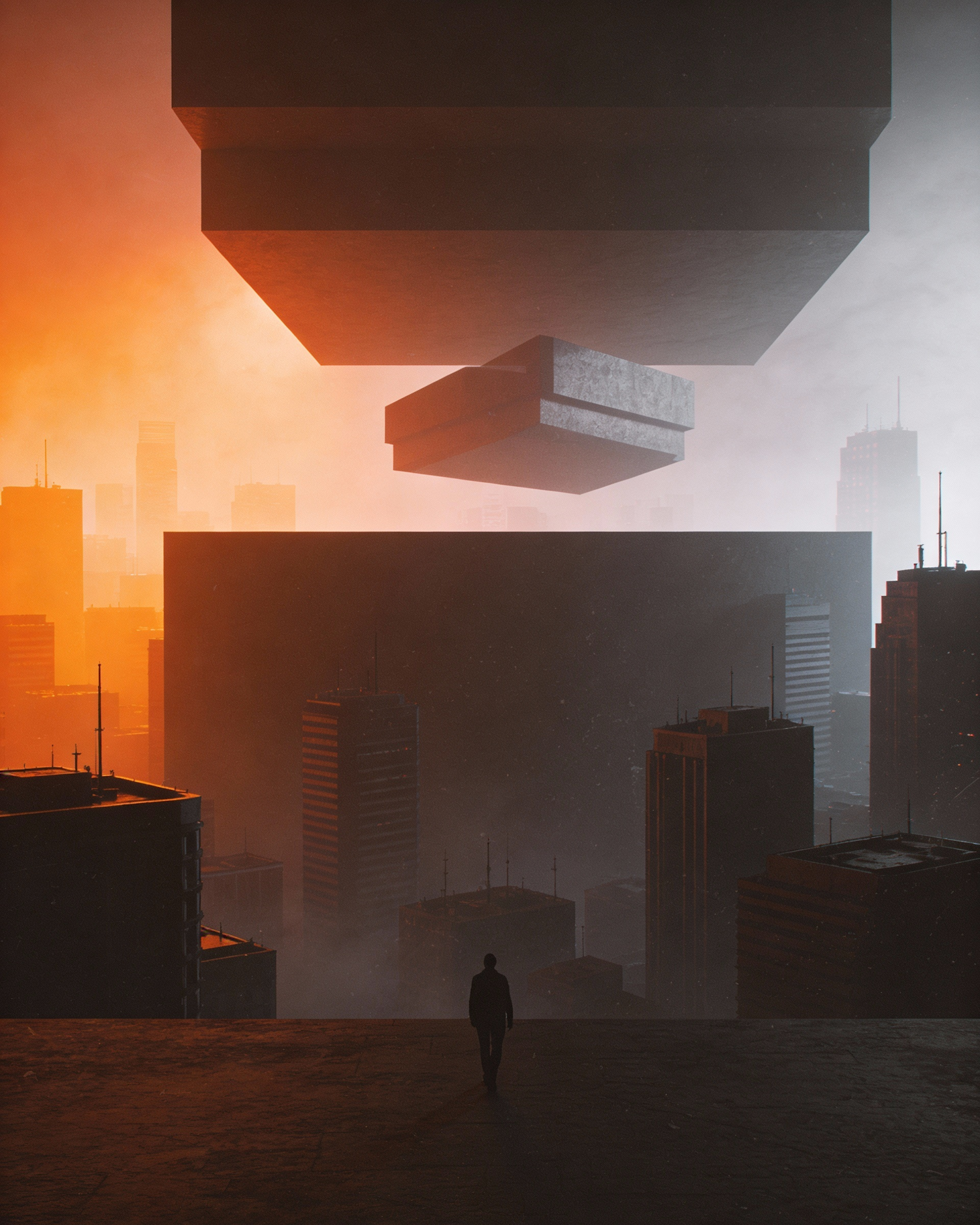 A lone figure stands on a ledge overlooking a futuristic cityscape with hovering structures and contrasting warm and cool lighting.
