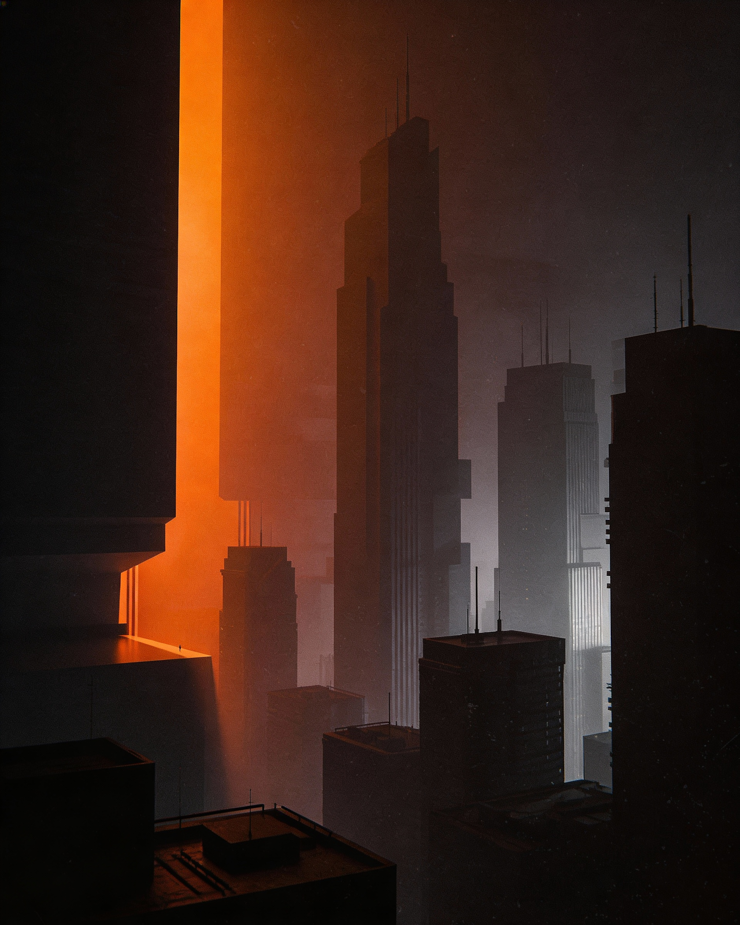 A dramatic cityscape with towering skyscrapers silhouetted against a gradient of orange and gray light, creating a futuristic and mysterious vibe.