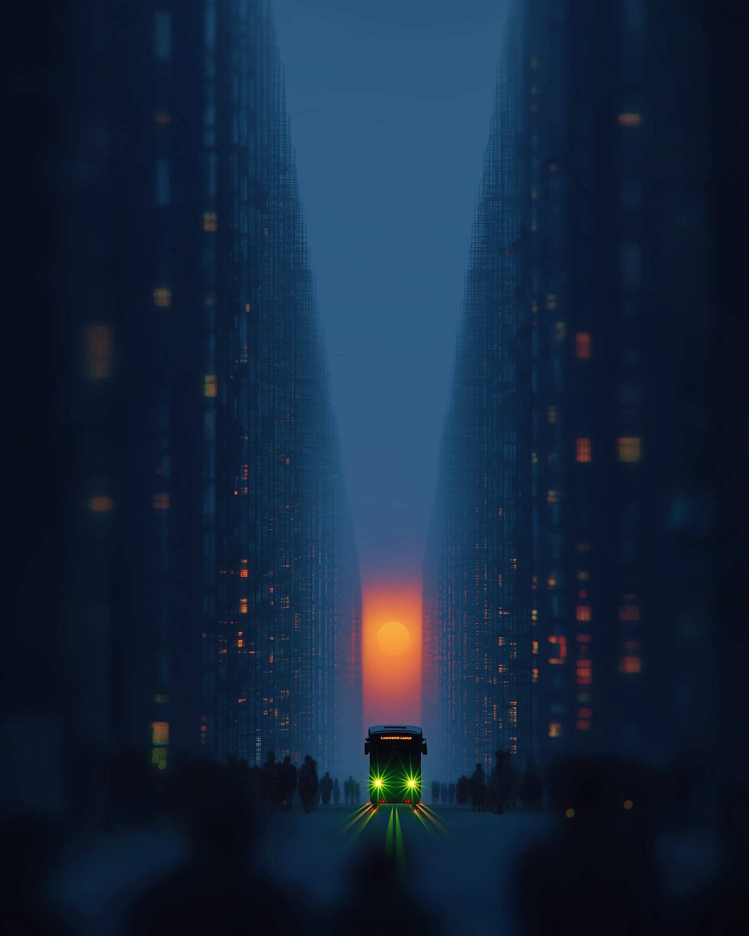 A futuristic cityscape with a glowing bus and a vibrant sunset framed by towering skyscrapers, creating a dramatic and immersive atmosphere.