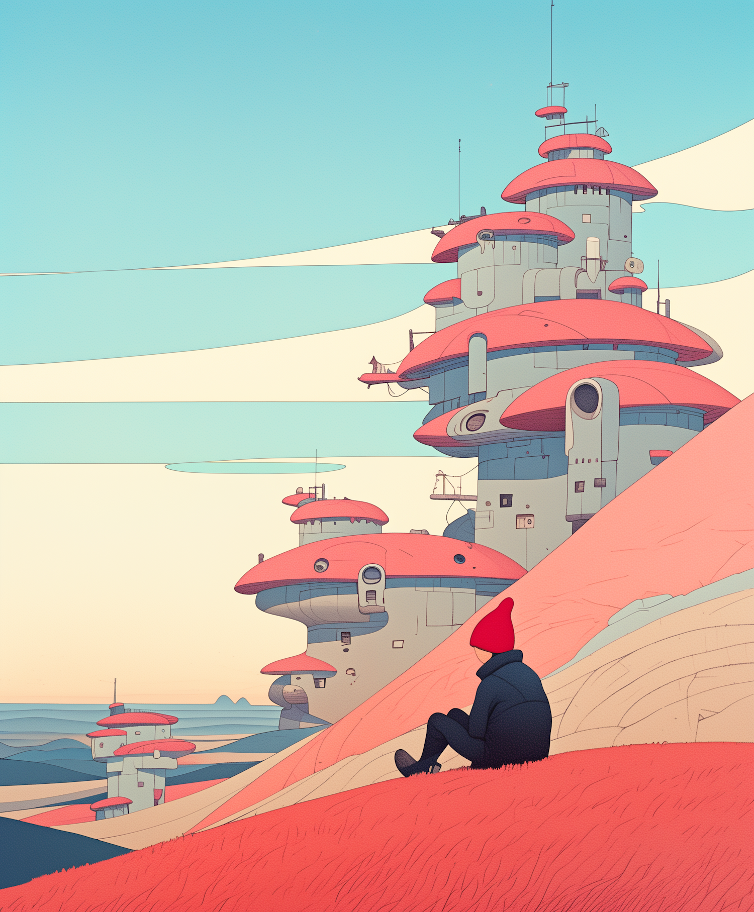 Futuristic scene with a person in a red beanie sitting on a hill, overlooking whimsical mushroom-like buildings under a serene sky.
