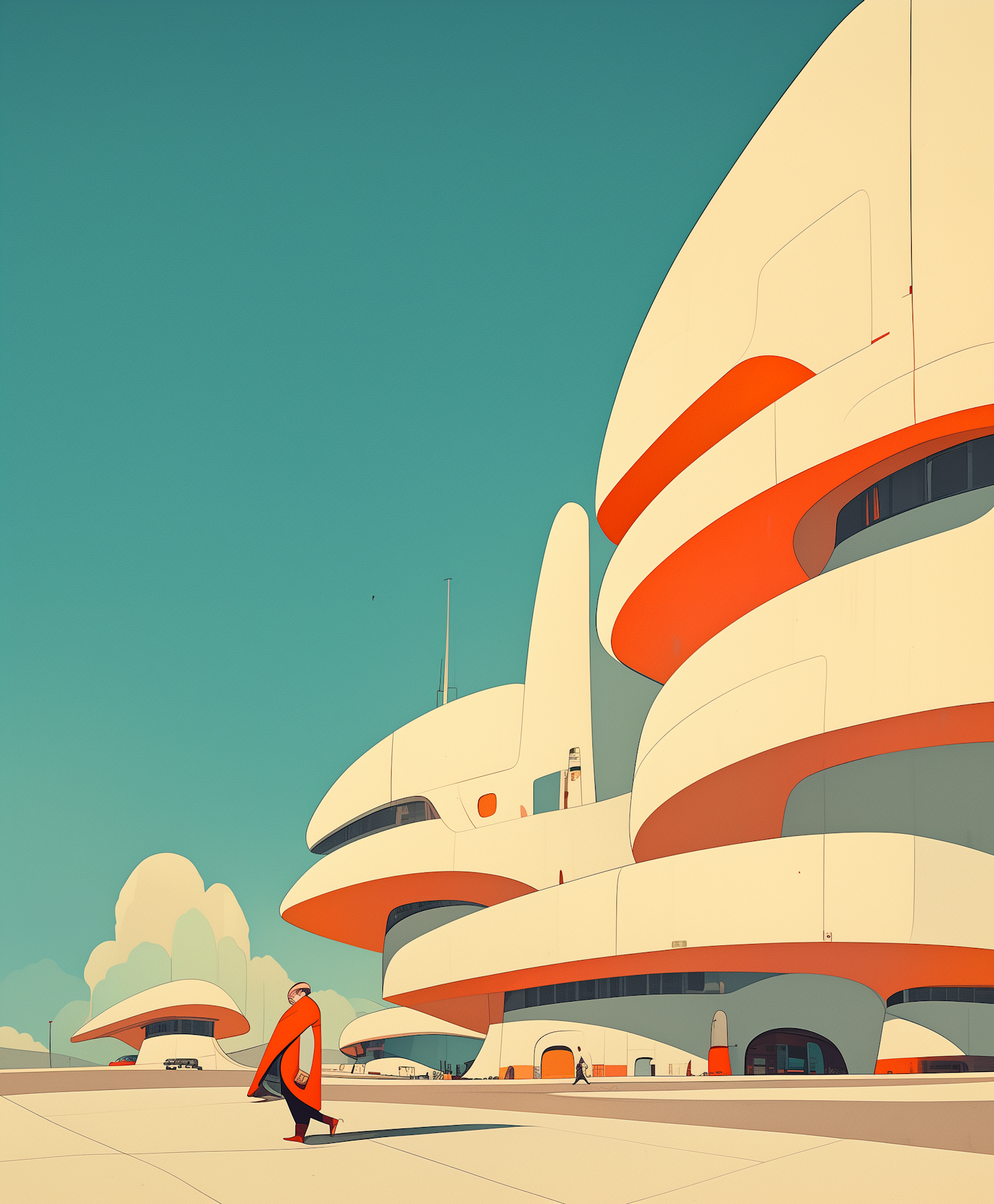 Futuristic architecture with sleek white and orange buildings under a teal sky, featuring a person in a red coat walking.