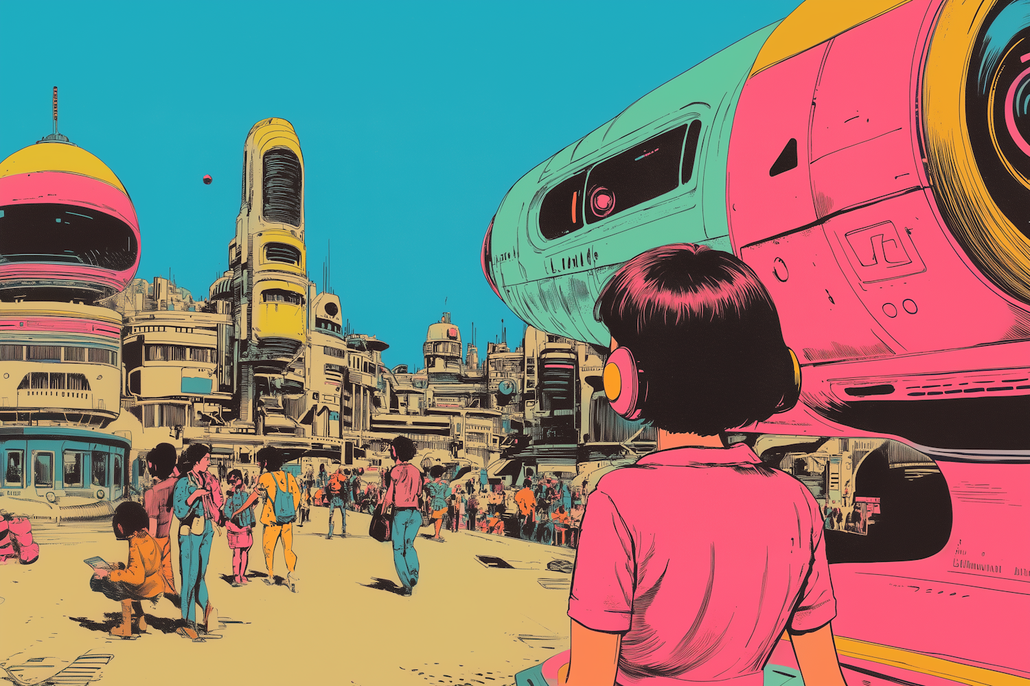 Retro-futuristic cityscape with colorful buildings, diverse crowd, and a person in pink near a futuristic vehicle under a clear blue sky.