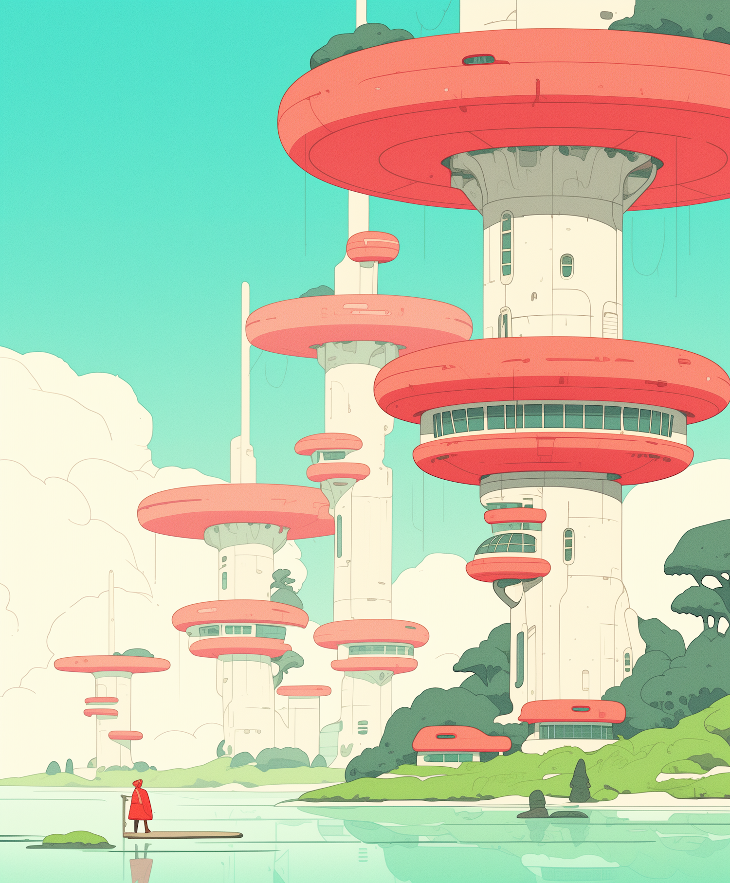 Futuristic landscape with towering coral structures and a lone figure in red by a serene water body, set against a turquoise sky.