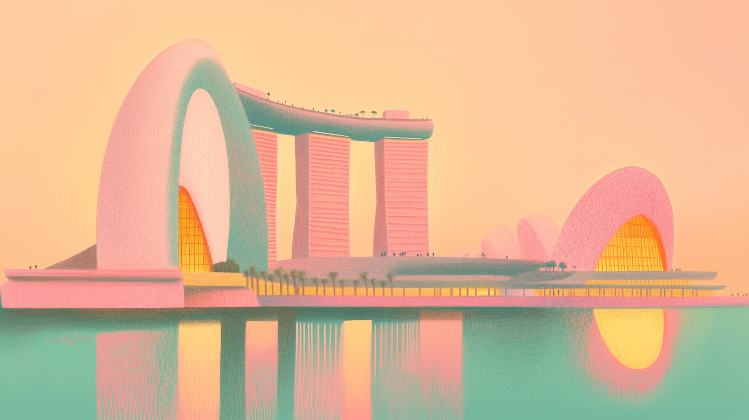 Dreamy pastel illustration of futuristic architecture with glowing domes, tall buildings, and serene water reflections.