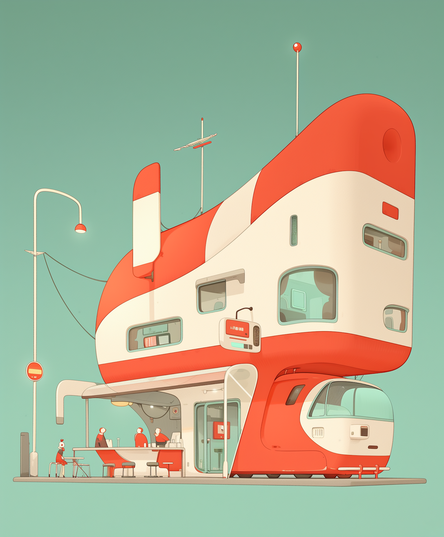 Futuristic diner with retro design, bold red and white colors, and a sleek, modern look against a teal sky.