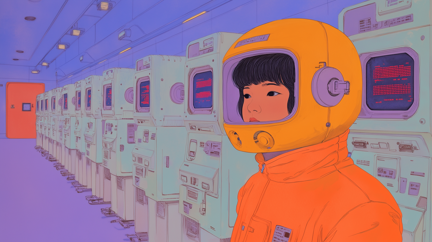 A young person in an orange space suit stands in a retro-futuristic control room with vintage computers and vibrant colors.