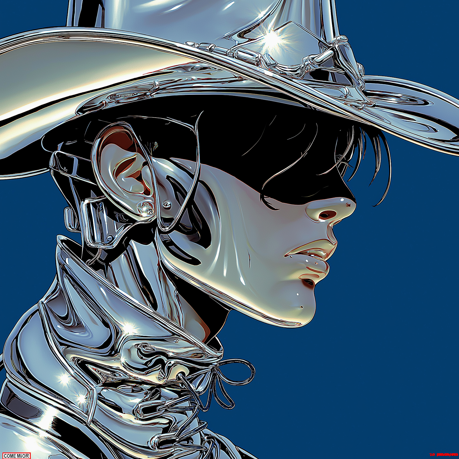 Futuristic illustration of a metallic figure in a cowboy hat against a blue background, blending human and robotic aesthetics.