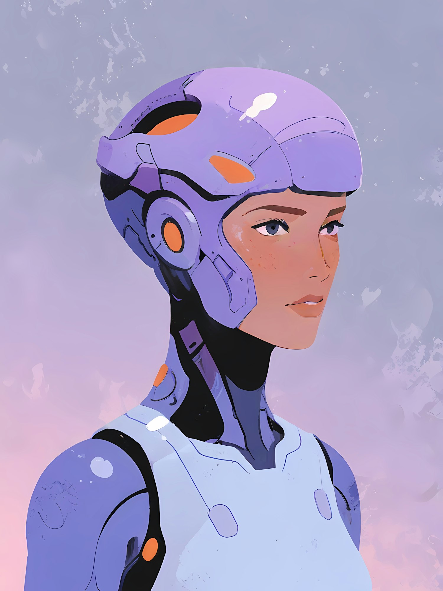 Futuristic female android with purple helmet and armor, set against a pastel background. Elegant design with blue eyes and orange accents.
