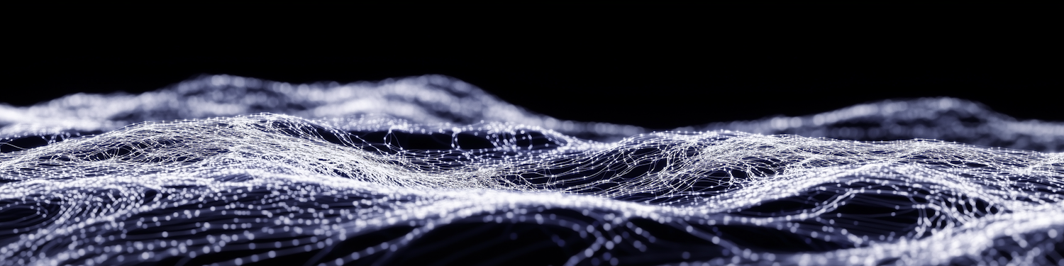Abstract digital waves formed by glowing white lines and dots on a black background, evoking a futuristic and tech-inspired aesthetic.