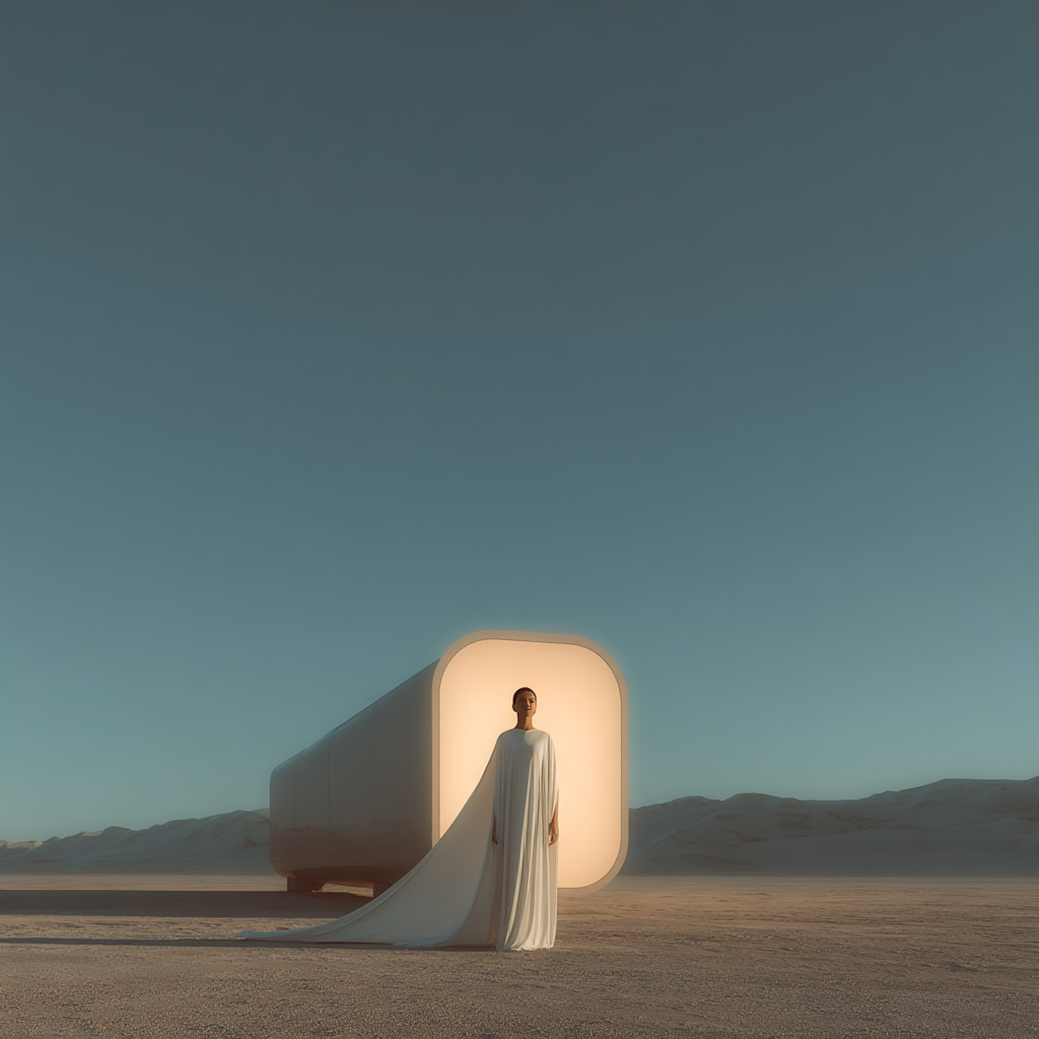 A futuristic scene with a glowing structure in a desert and a person in flowing white attire, evoking a serene and modern atmosphere.