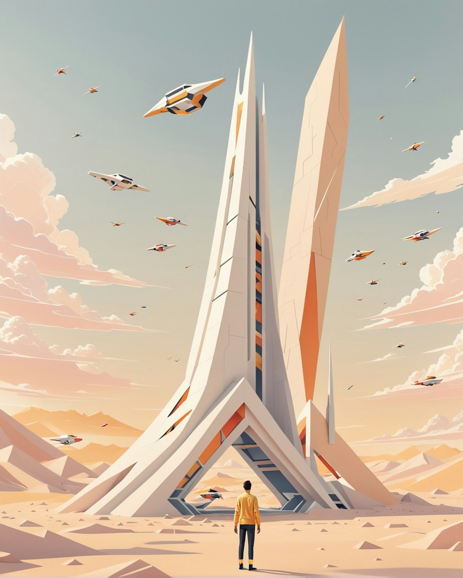 Futuristic desert scene with a towering angular structure, flying spacecraft, and a lone figure in a yellow jacket. Stunning sci-fi vibes!