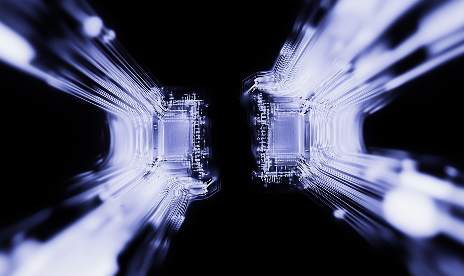 Abstract glowing circuits connected by light streams in a dark void, evoking futuristic technology and digital connectivity.