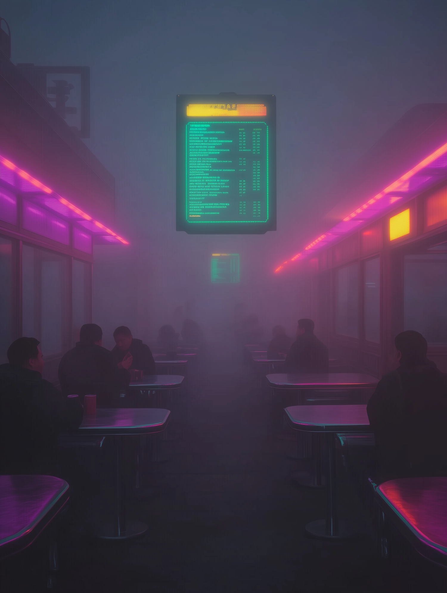Futuristic diner with neon lights and a digital menu board, enveloped in mist. Mysterious ambiance with silhouetted patrons.