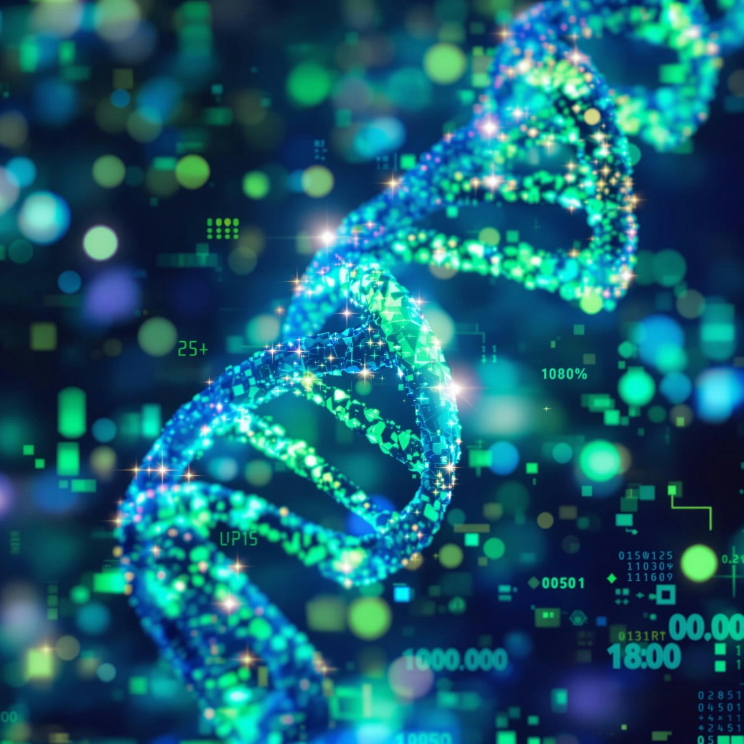 Futuristic digital DNA helix glowing in green and blue, surrounded by data elements and bokeh lights, symbolizing genetics and technology.