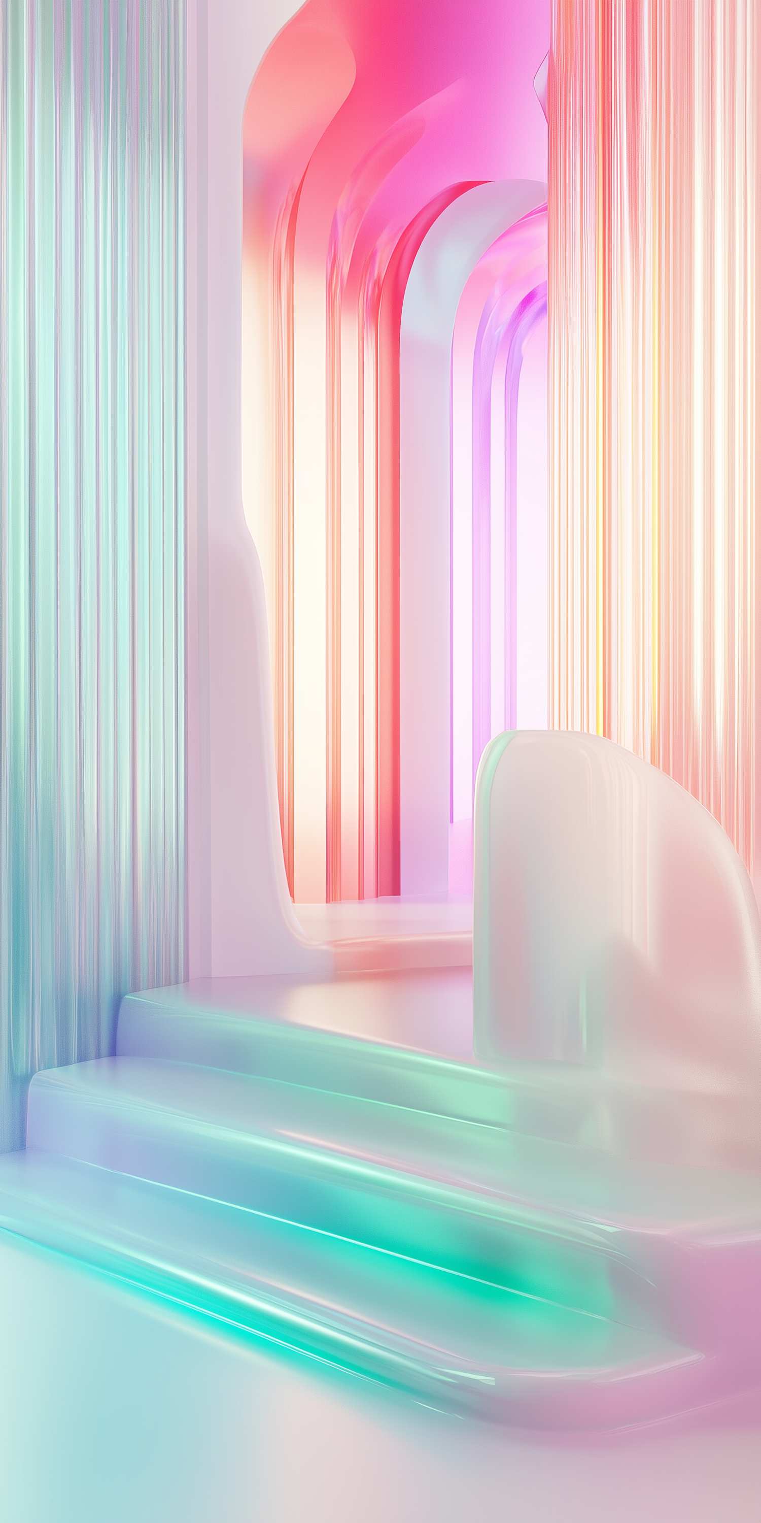 Dreamy pastel-hued futuristic interior with glowing arches, glossy textures, and soft gradients of pink, blue, and purple.