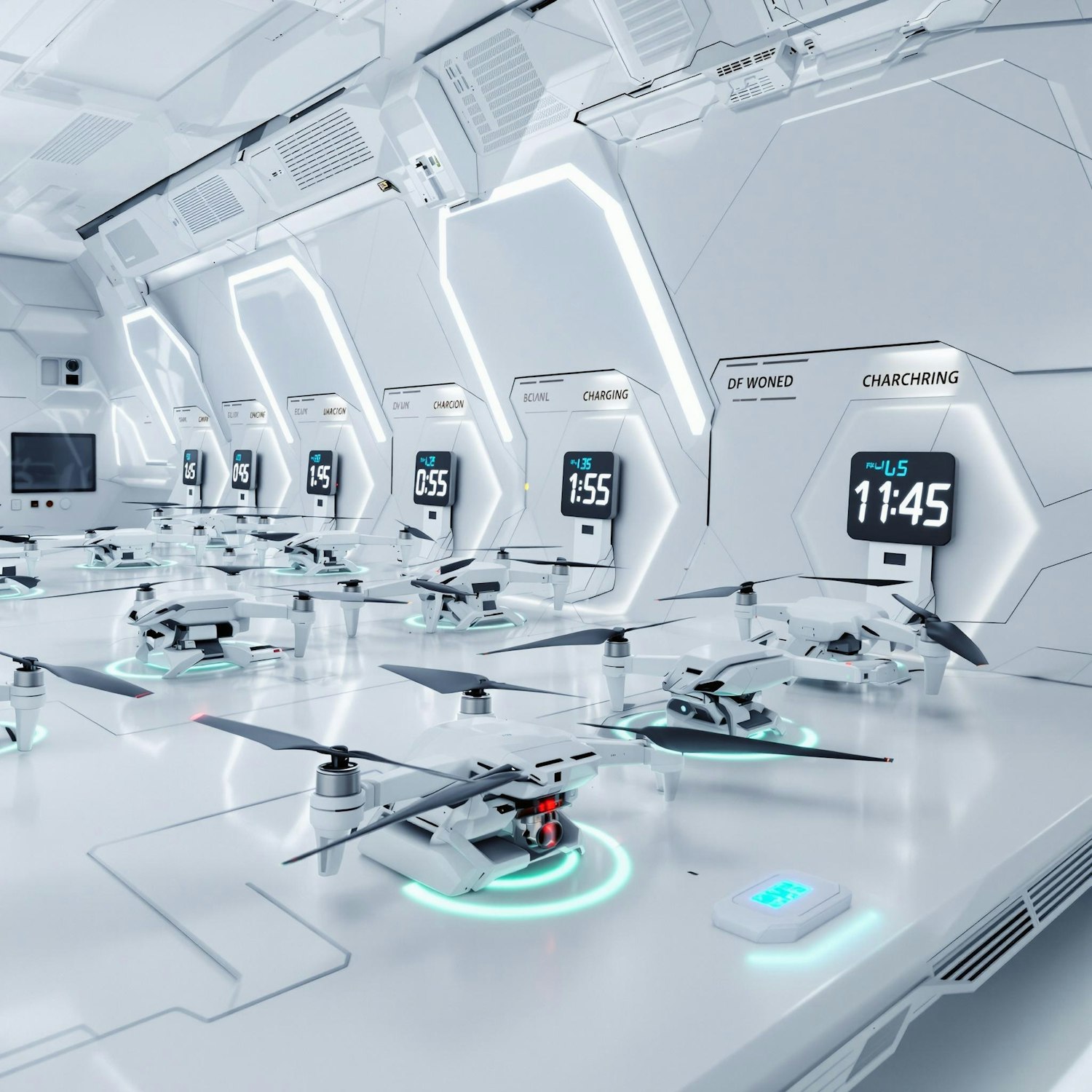 Futuristic drone charging station with sleek white design, glowing LED lights, and digital displays showing charging statuses.