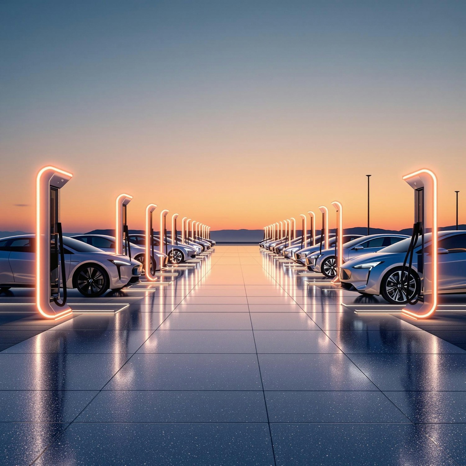 Futuristic EV charging station at sunset with glowing orange chargers and sleek electric cars on a reflective surface.