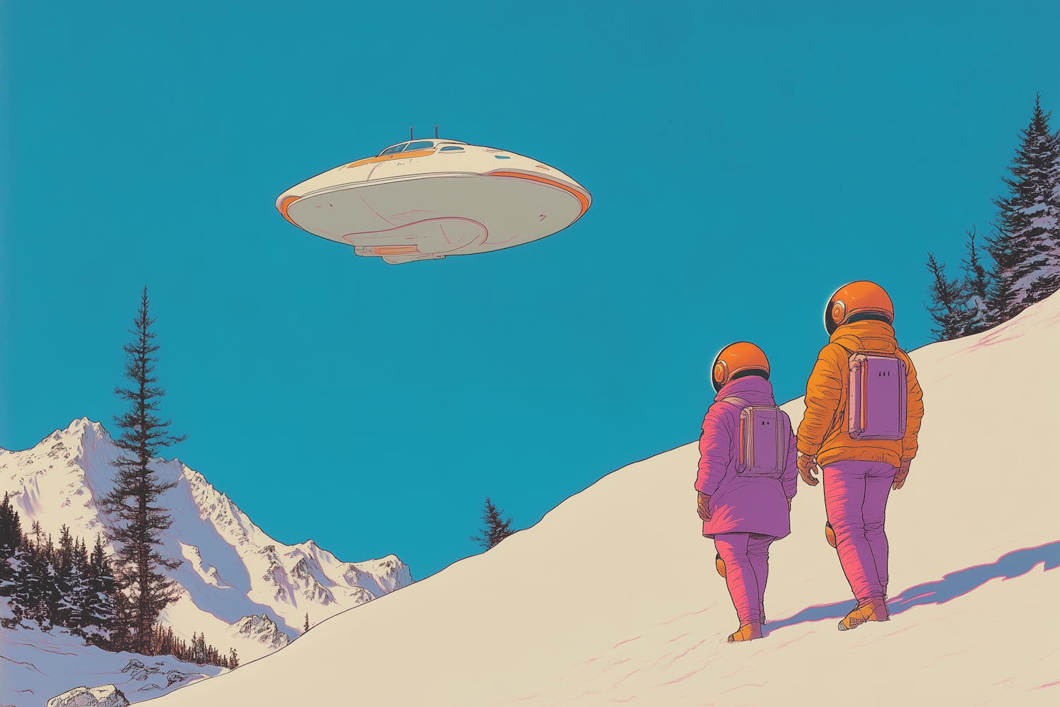 Two astronauts in colorful suits watch a UFO hover over snowy mountains under a clear blue sky.