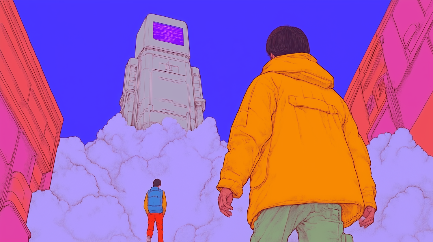 Two figures in colorful jackets face a giant robot in a surreal, vibrant landscape with a striking blue sky.