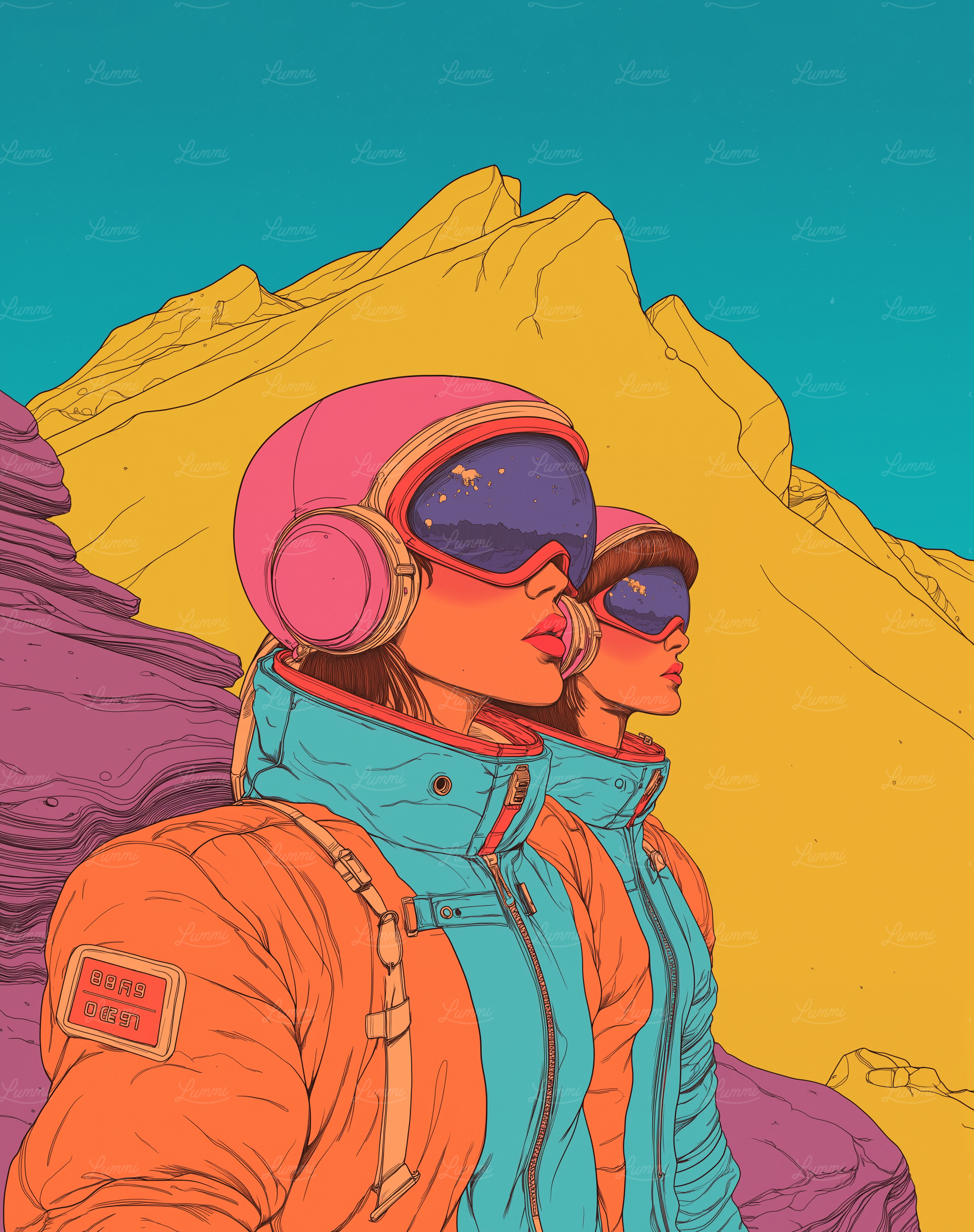 Futuristic explorers in vibrant gear gaze at a surreal landscape with yellow mountains and a turquoise sky. Retro-futuristic vibes.