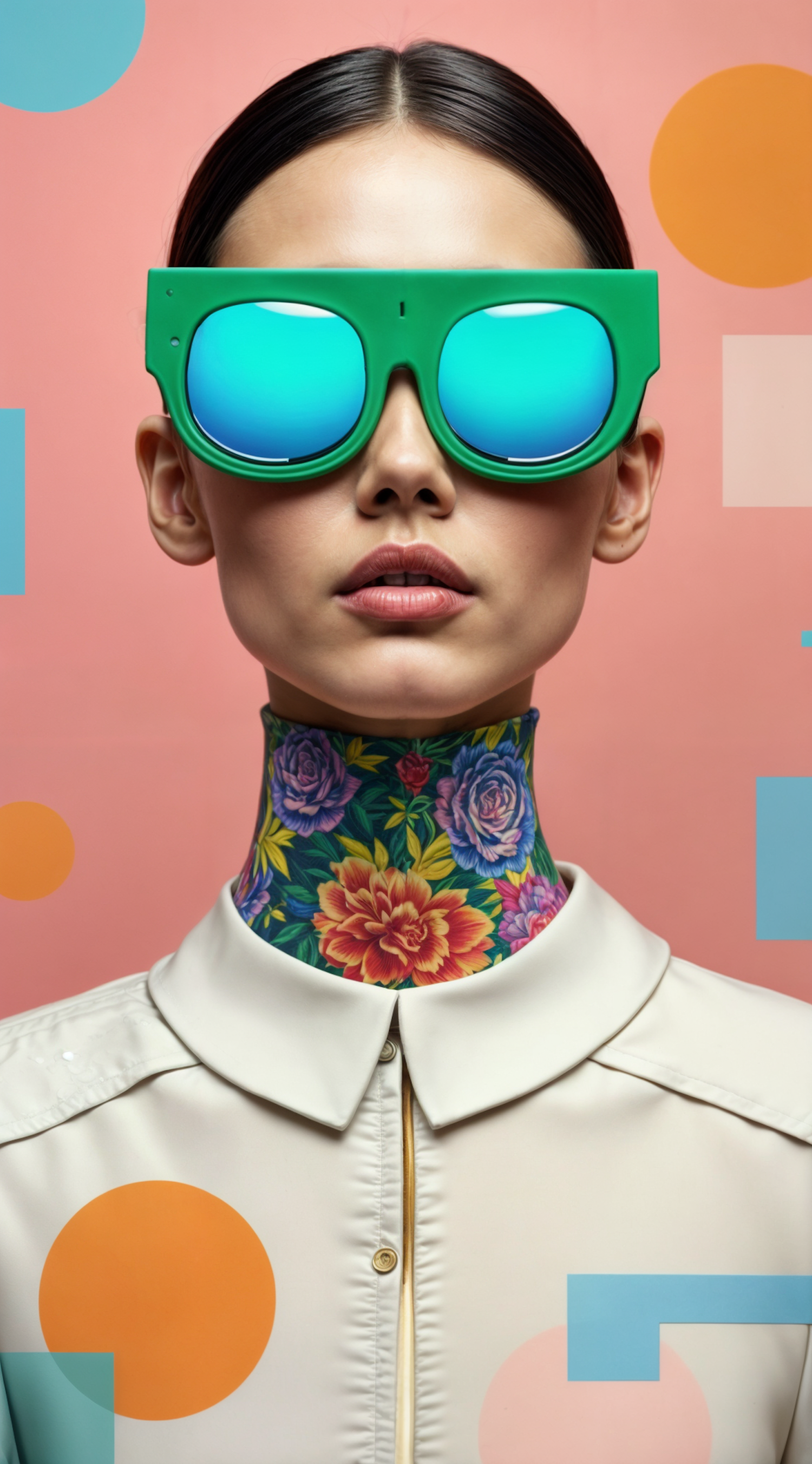 Stylish woman with futuristic green sunglasses and vibrant floral neck tattoo against a geometric pastel background.