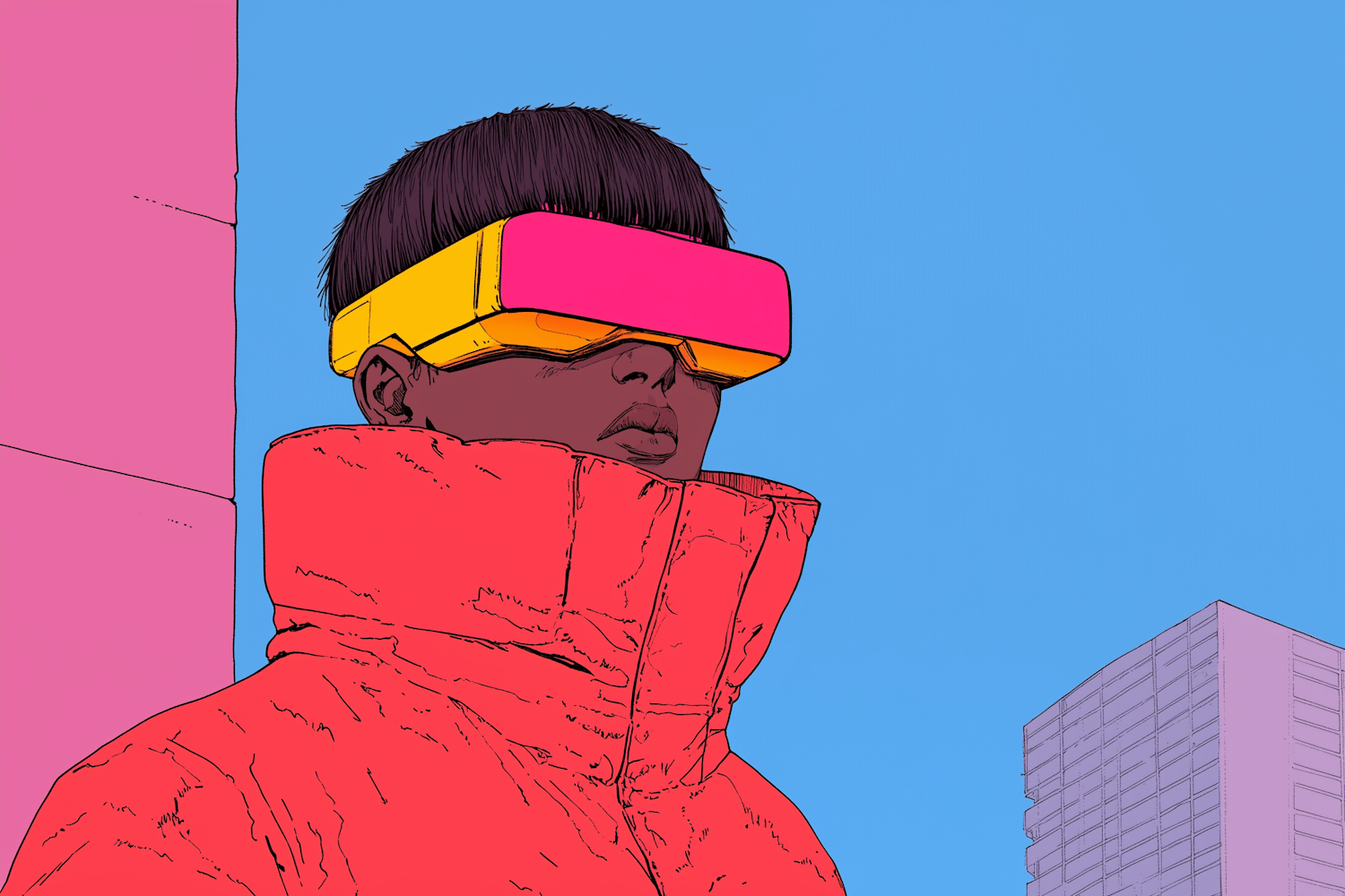 Futuristic illustration of a person in a red jacket with a pink-yellow visor against a blue sky and modern building.