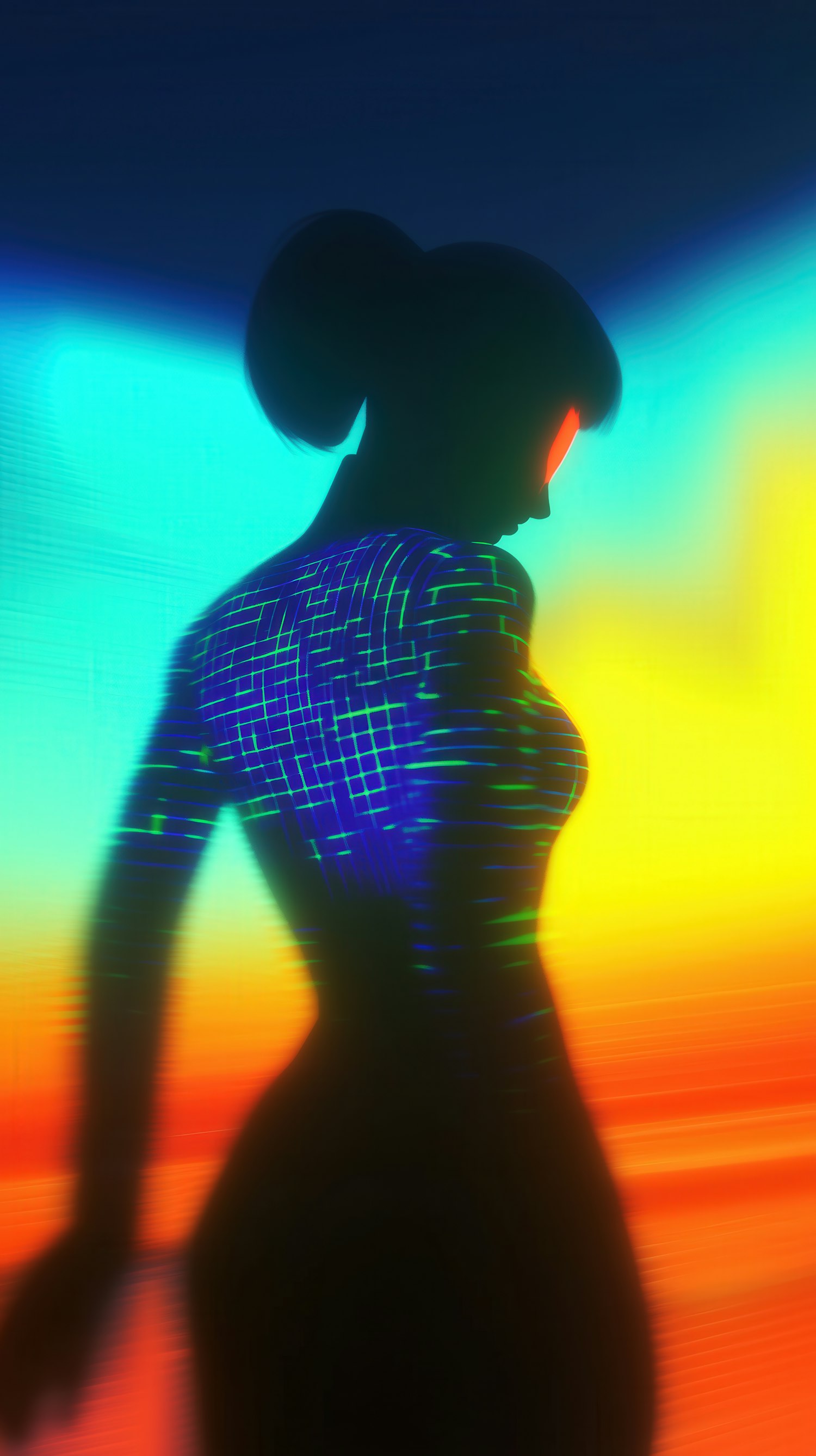 Abstract silhouette of a futuristic woman with glowing grid patterns, vibrant gradient background, and striking red-lit eyes.