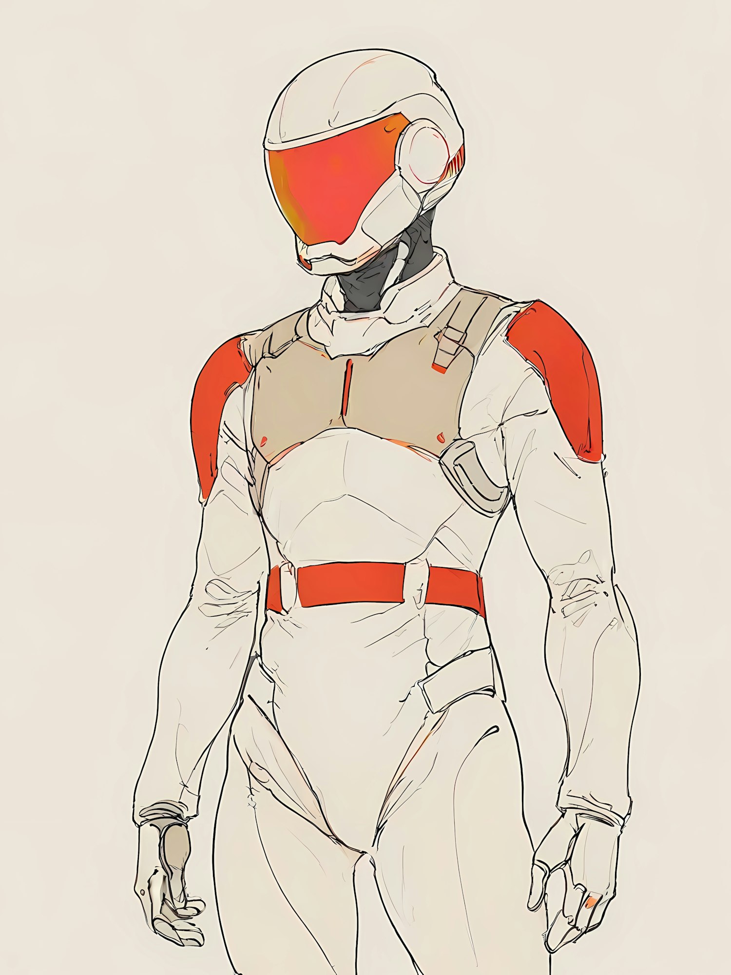 Futuristic figure in a sleek white and red suit with a reflective visor, showcasing advanced technology and minimalistic design.