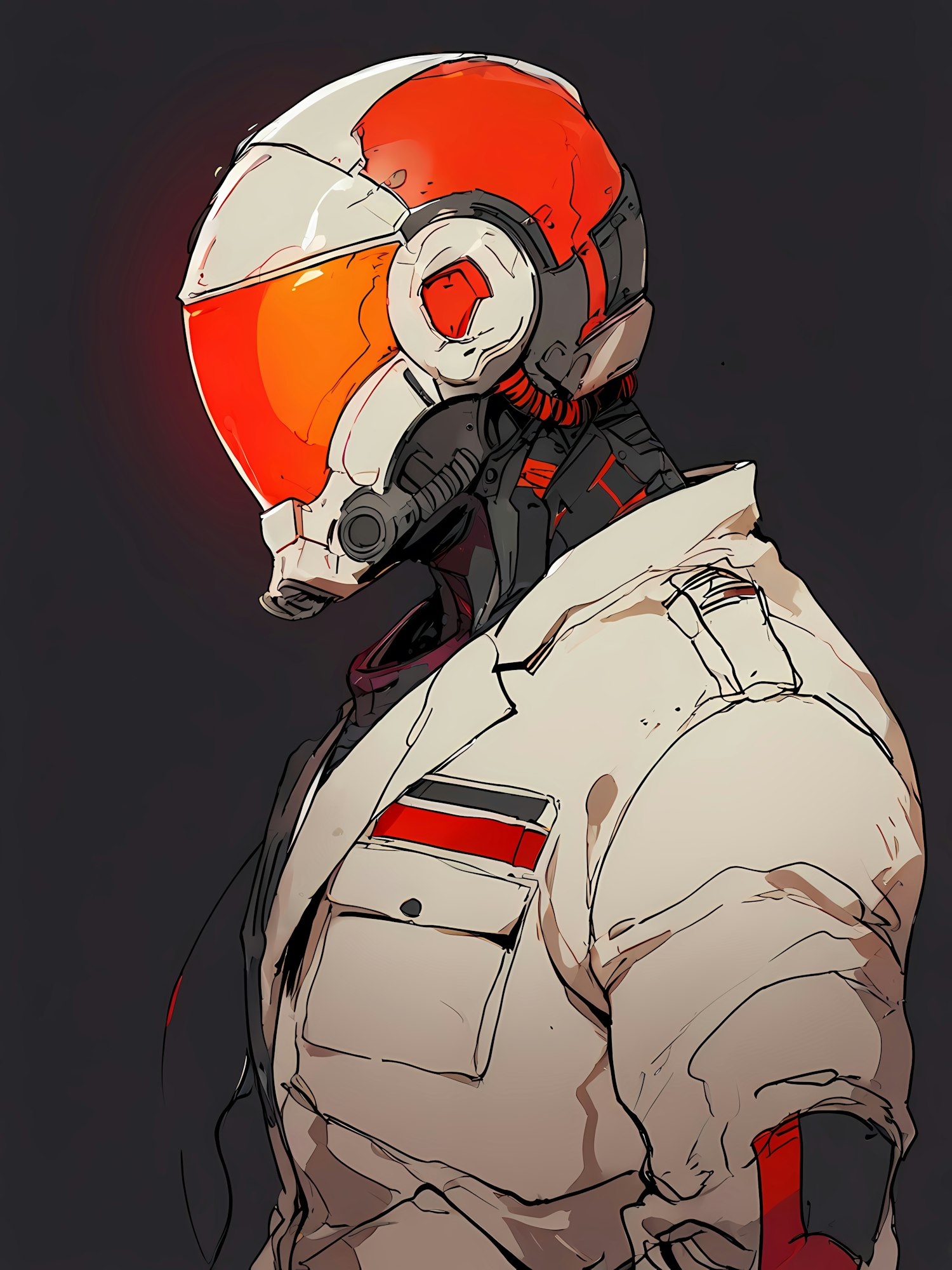 Futuristic character in a high-tech helmet with orange visor and white suit, featuring sci-fi design elements and glowing accents.