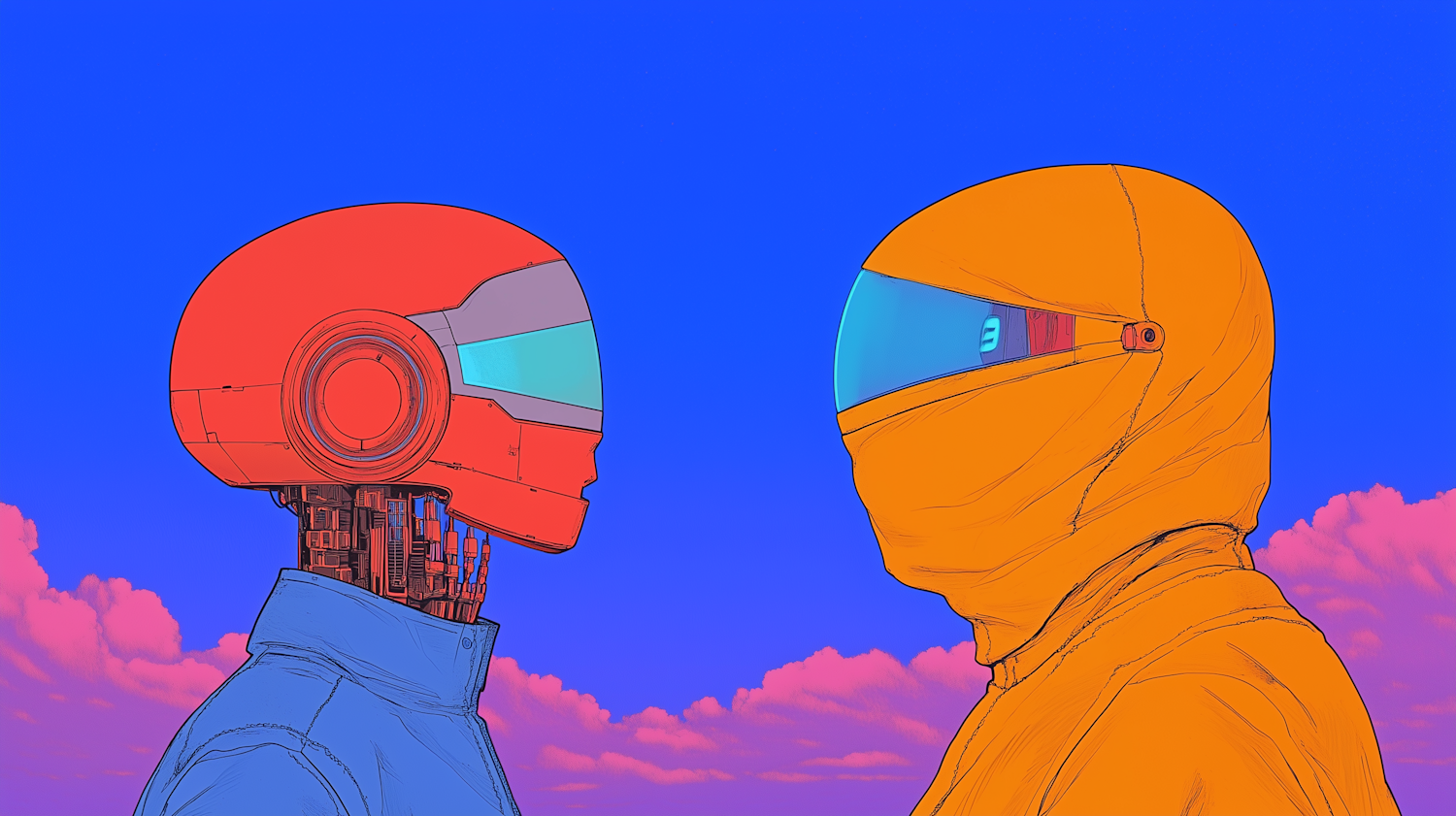 Two futuristic robots face each other against a vibrant blue sky with pink clouds, showcasing sleek red and orange helmets.