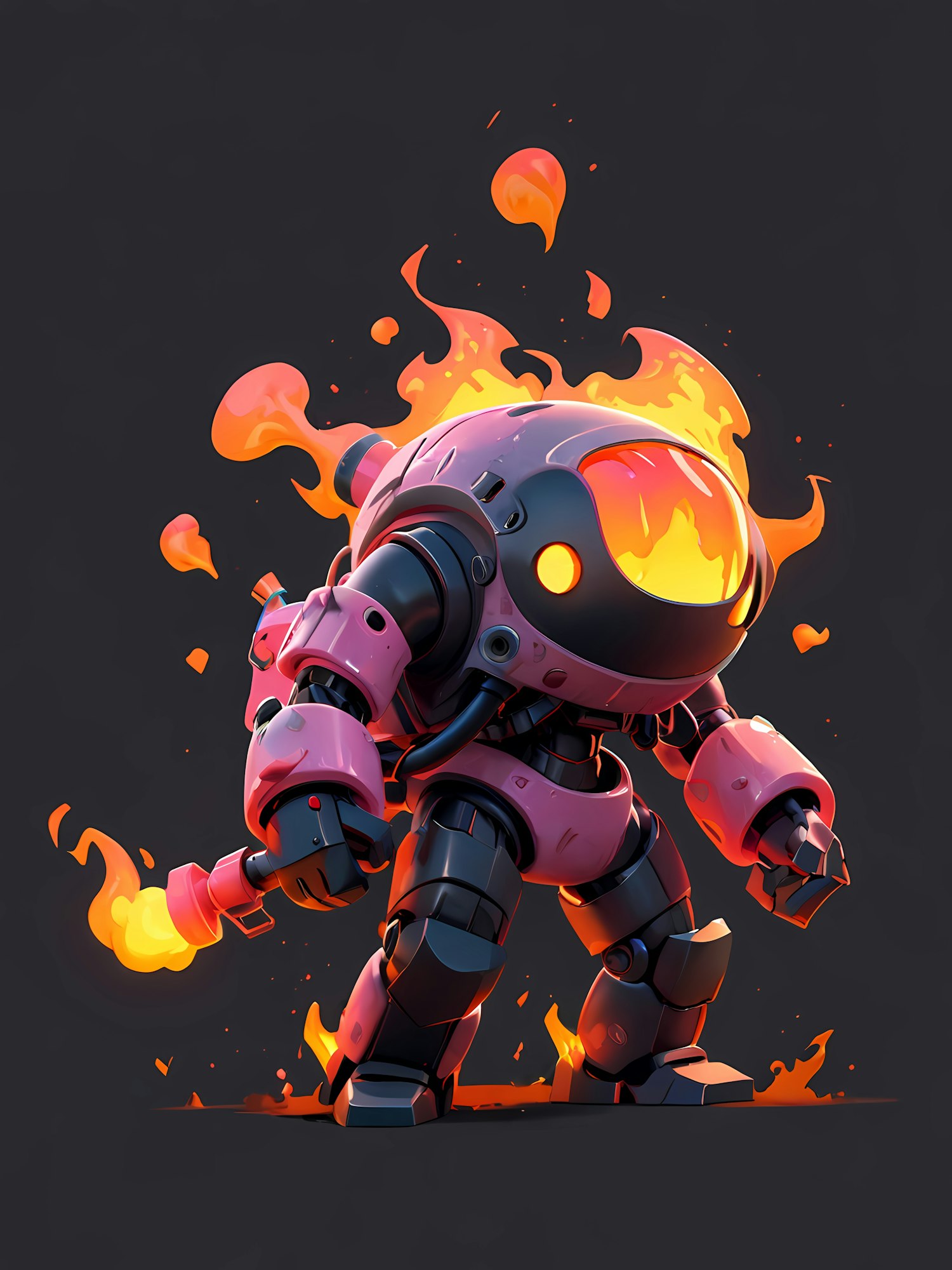 A fiery pink robot with glowing orange accents and flames erupting from its body, holding a torch against a dark background.