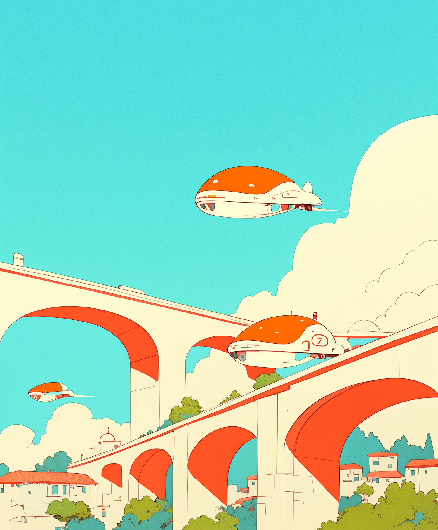 Futuristic flying vehicles hover over arched bridges in a vibrant, retro-futuristic cityscape with lush greenery and a bright blue sky.