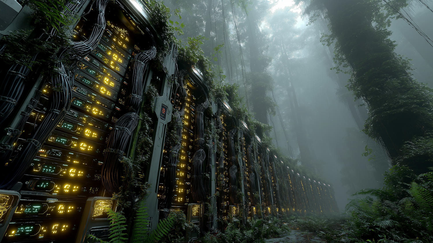 A misty forest with futuristic servers overgrown by vines and ferns, blending technology and nature in a serene, mysterious setting.