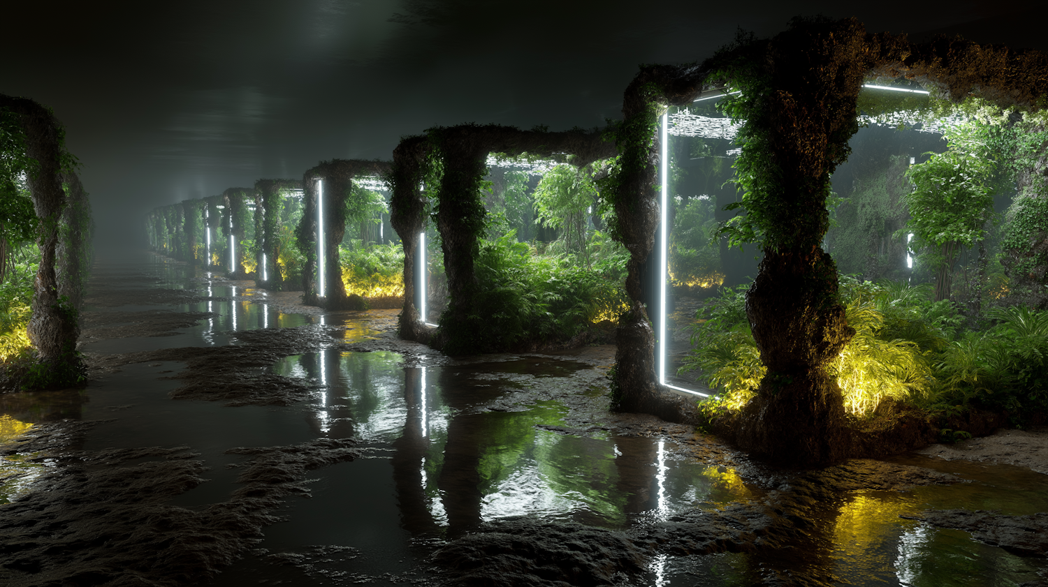 A futuristic garden with glowing frames, lush greenery, and a reflective wet ground, creating a surreal and misty atmosphere.