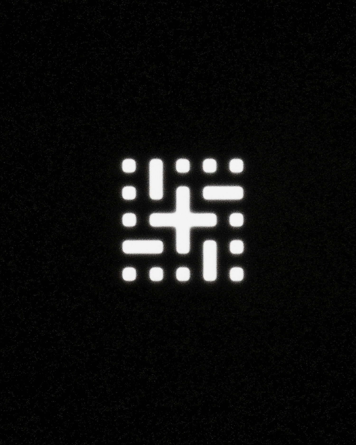 Glowing white geometric pattern with a cross and dots on a black background, creating a sleek and futuristic design.