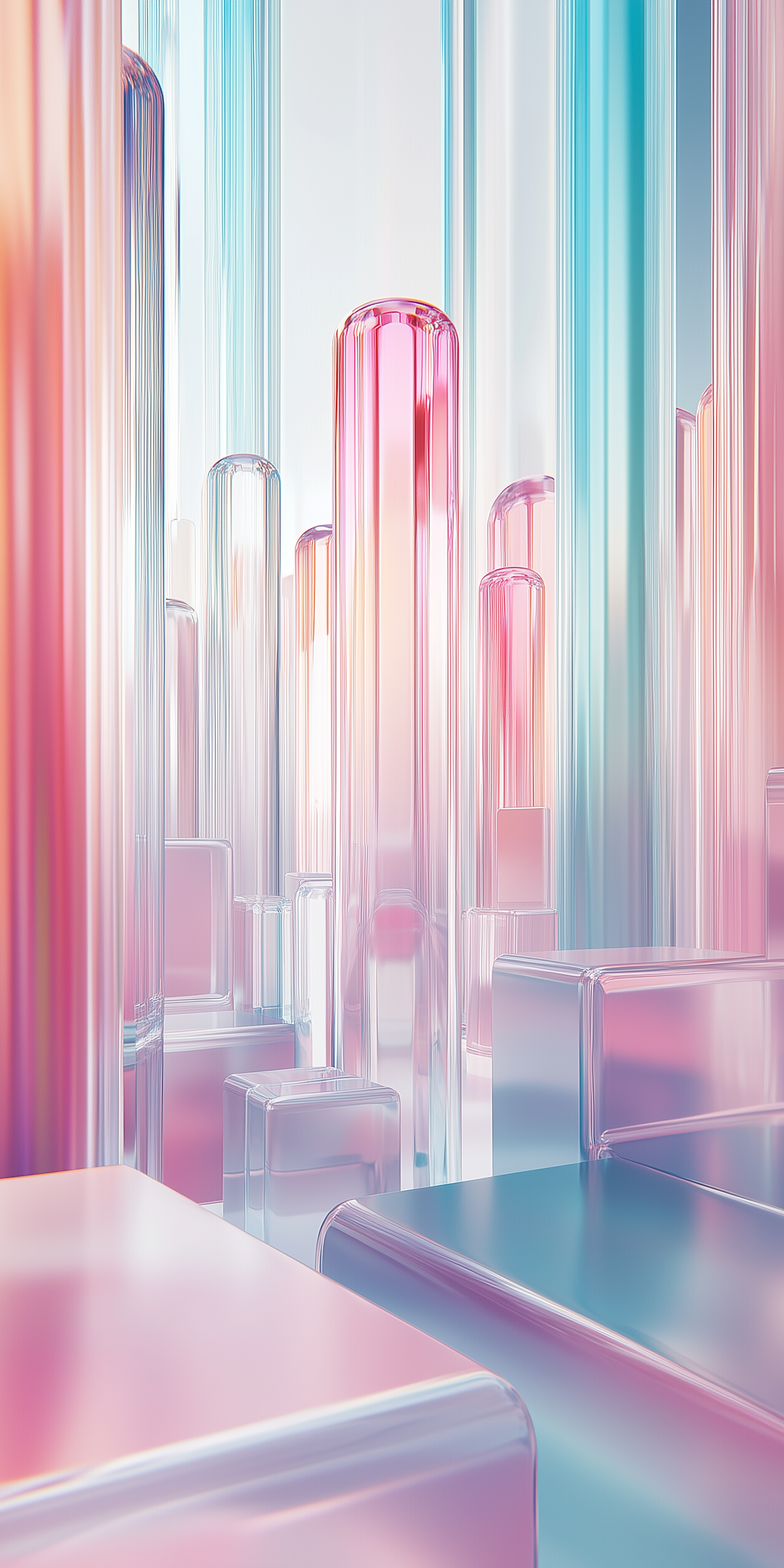 Dreamy pastel glass-like structures in pink, blue, and purple hues, resembling a futuristic cityscape with glowing reflections.