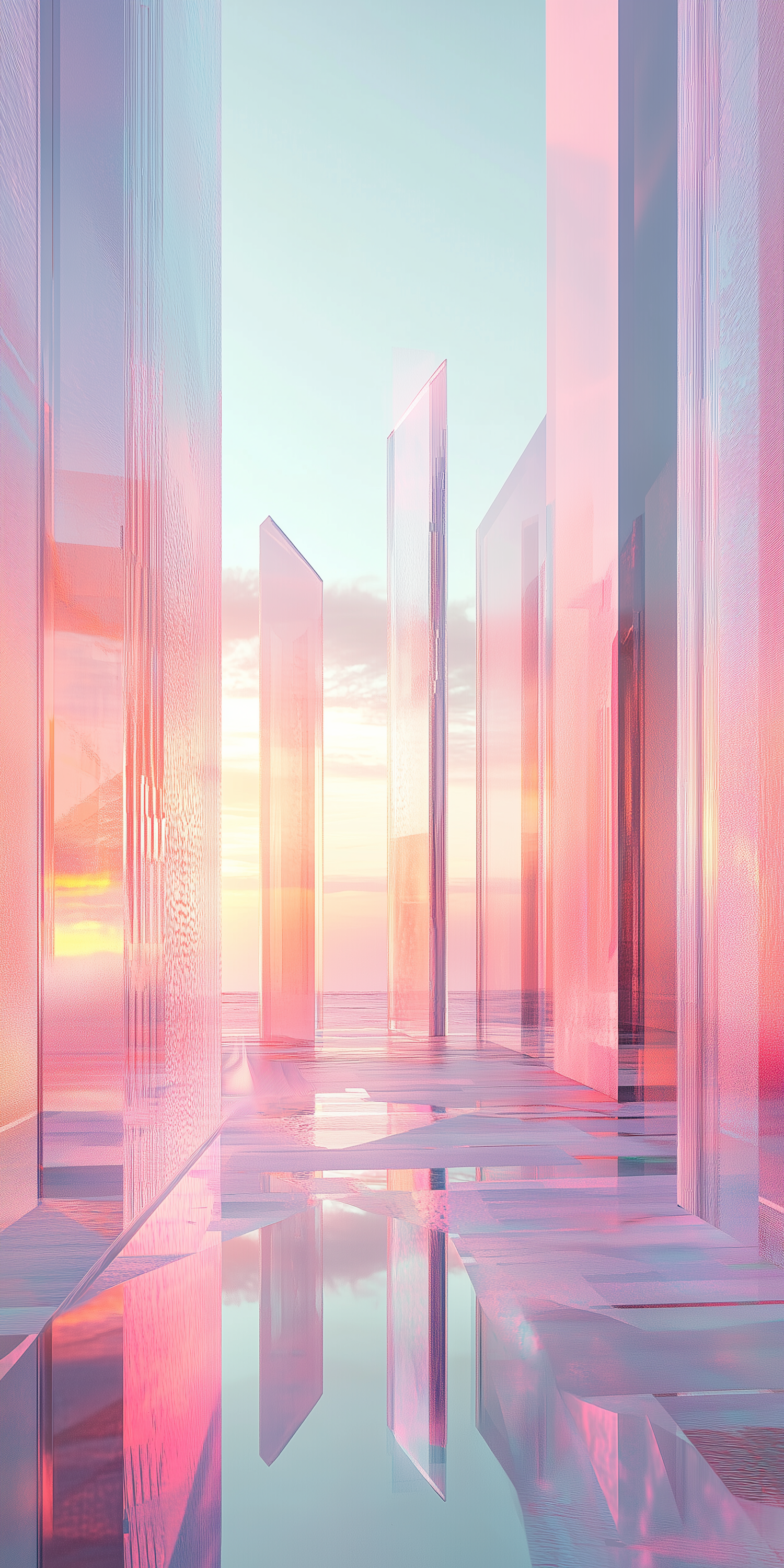 Futuristic glass-like structures in pink and purple reflect a pastel sky, creating a dreamy, surreal atmosphere with mirrored surfaces.