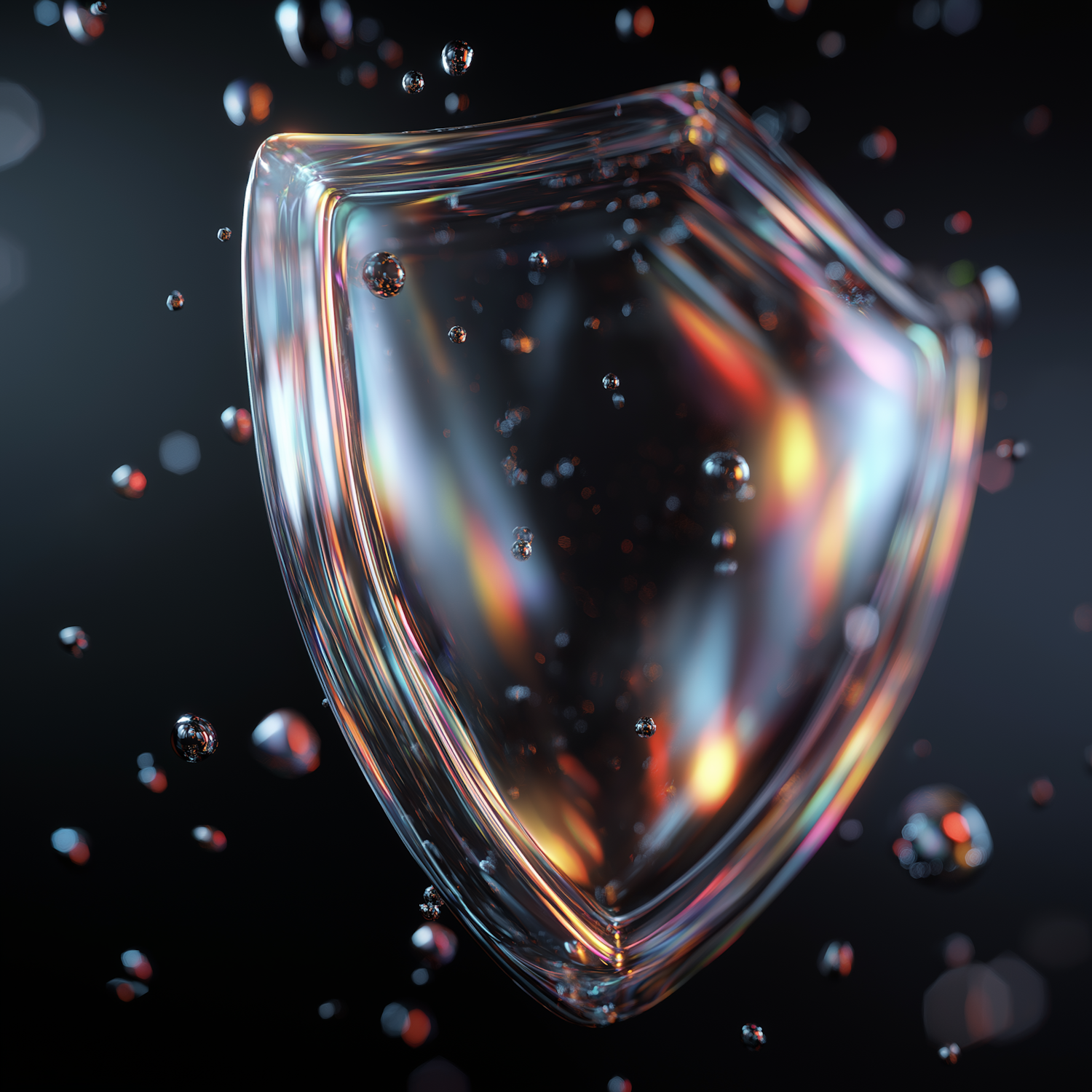 A glowing, transparent shield with vibrant reflections floats in a dark space, surrounded by suspended droplets for a futuristic vibe.