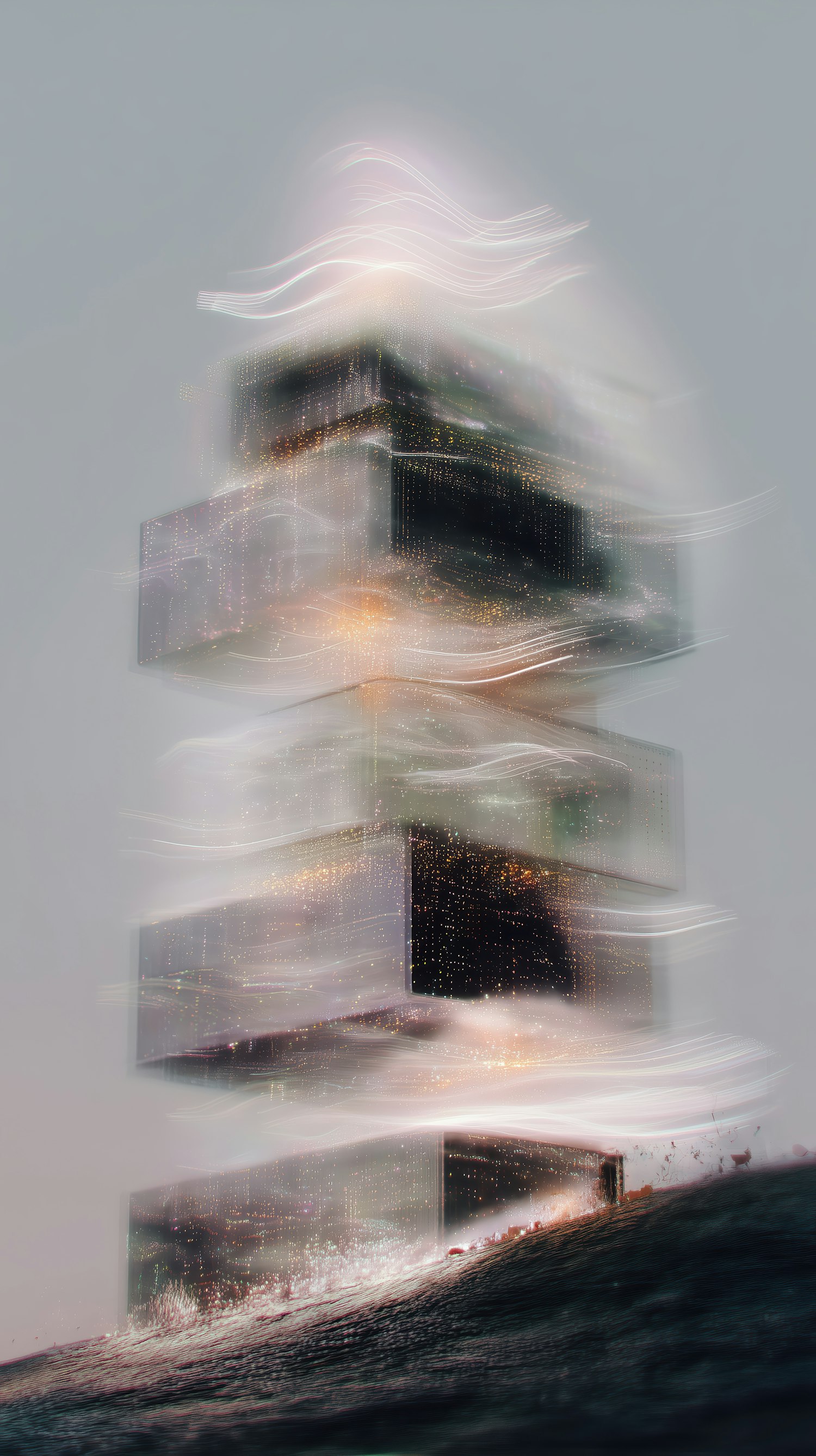A surreal glowing tower of stacked cubes with flowing light trails, set against a muted gray background for a futuristic aesthetic.