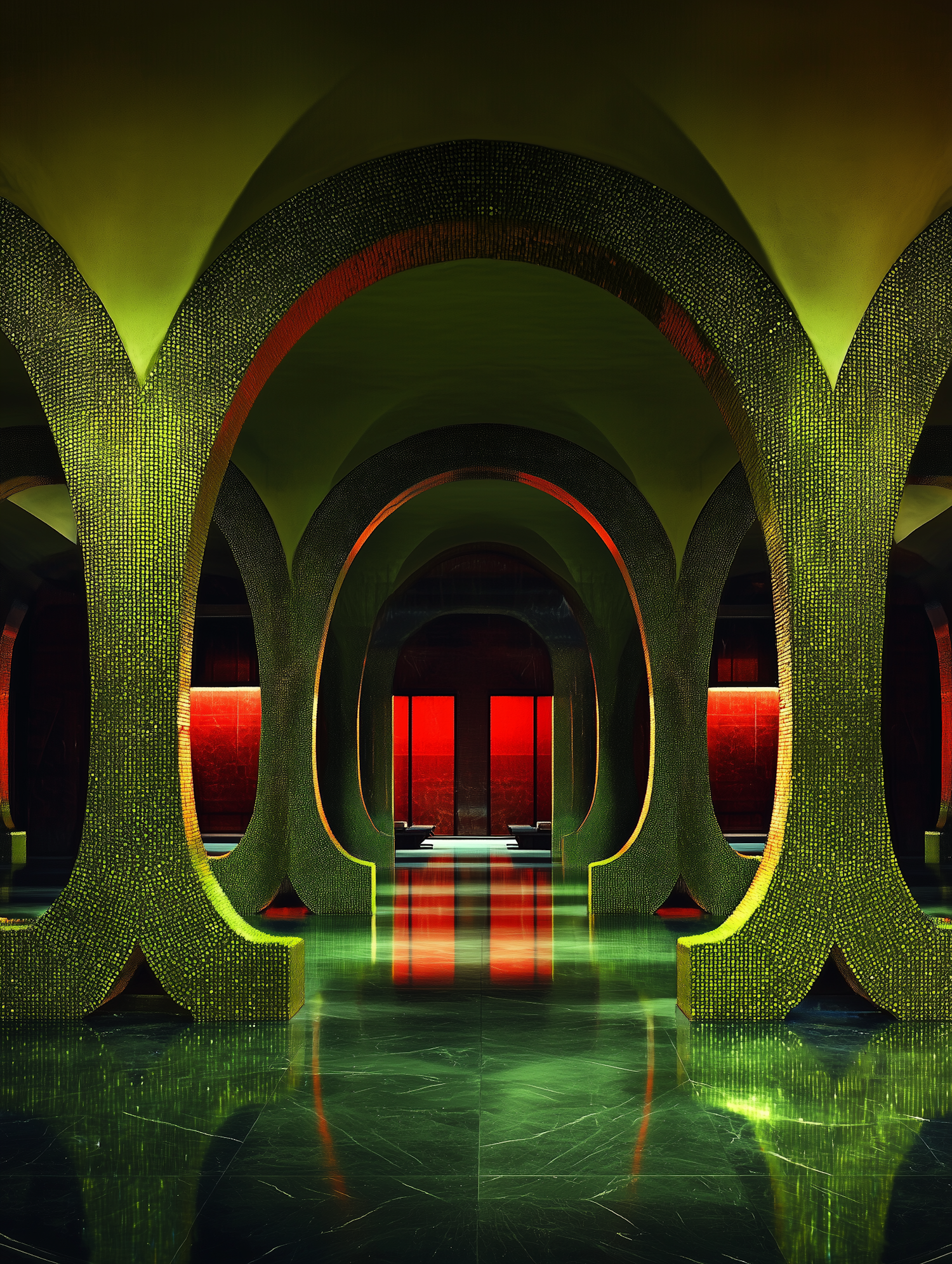 A surreal interior with shimmering green arches, glossy marble floors, and warm red lighting creating a futuristic, luxurious ambiance.