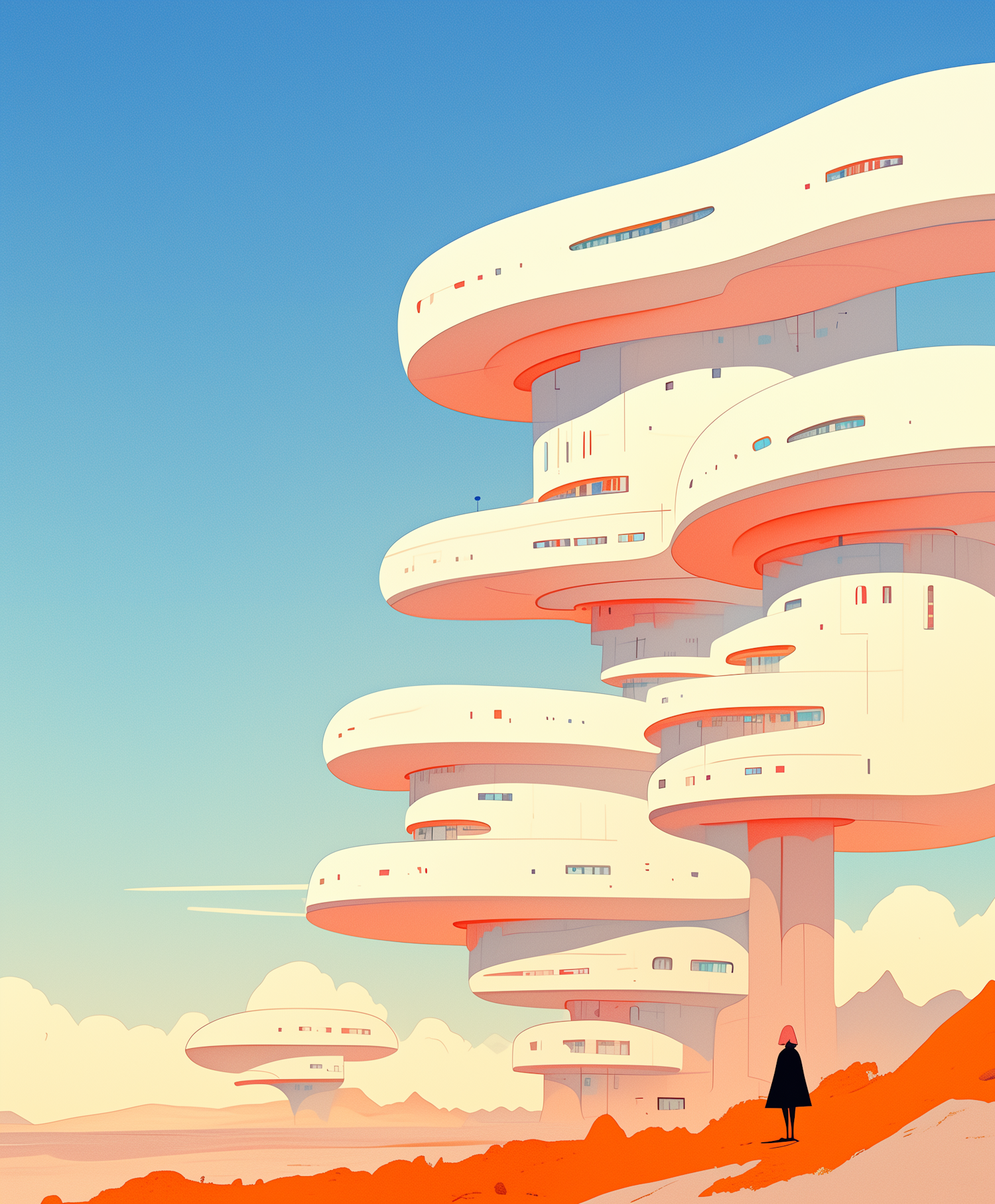 Futuristic architecture with circular buildings and a lone figure in a cloak, set against a clear blue sky and orange landscape.
