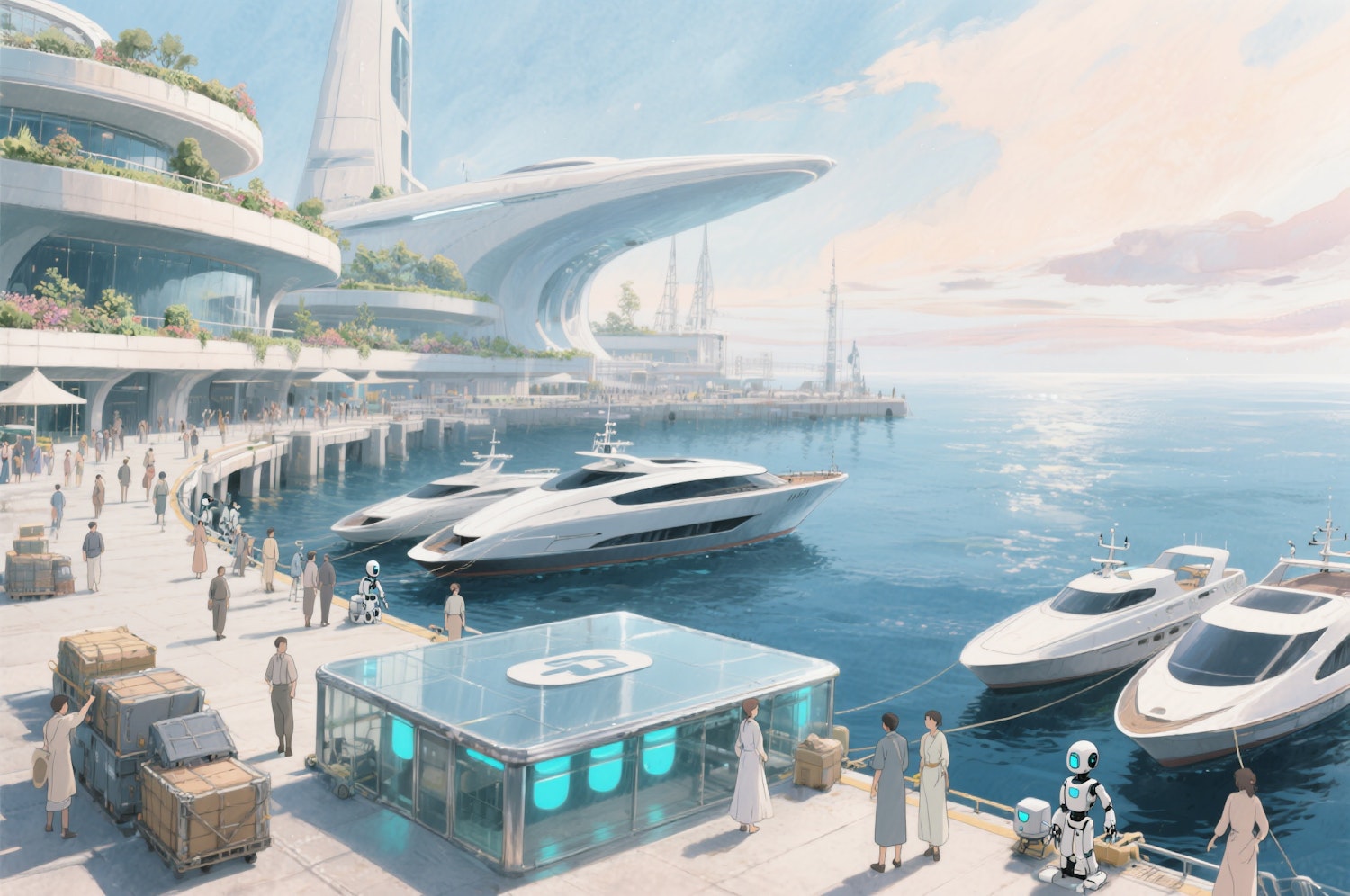 Futuristic harbor with sleek yachts, modern architecture, and robots assisting people on a sunny day by the water.