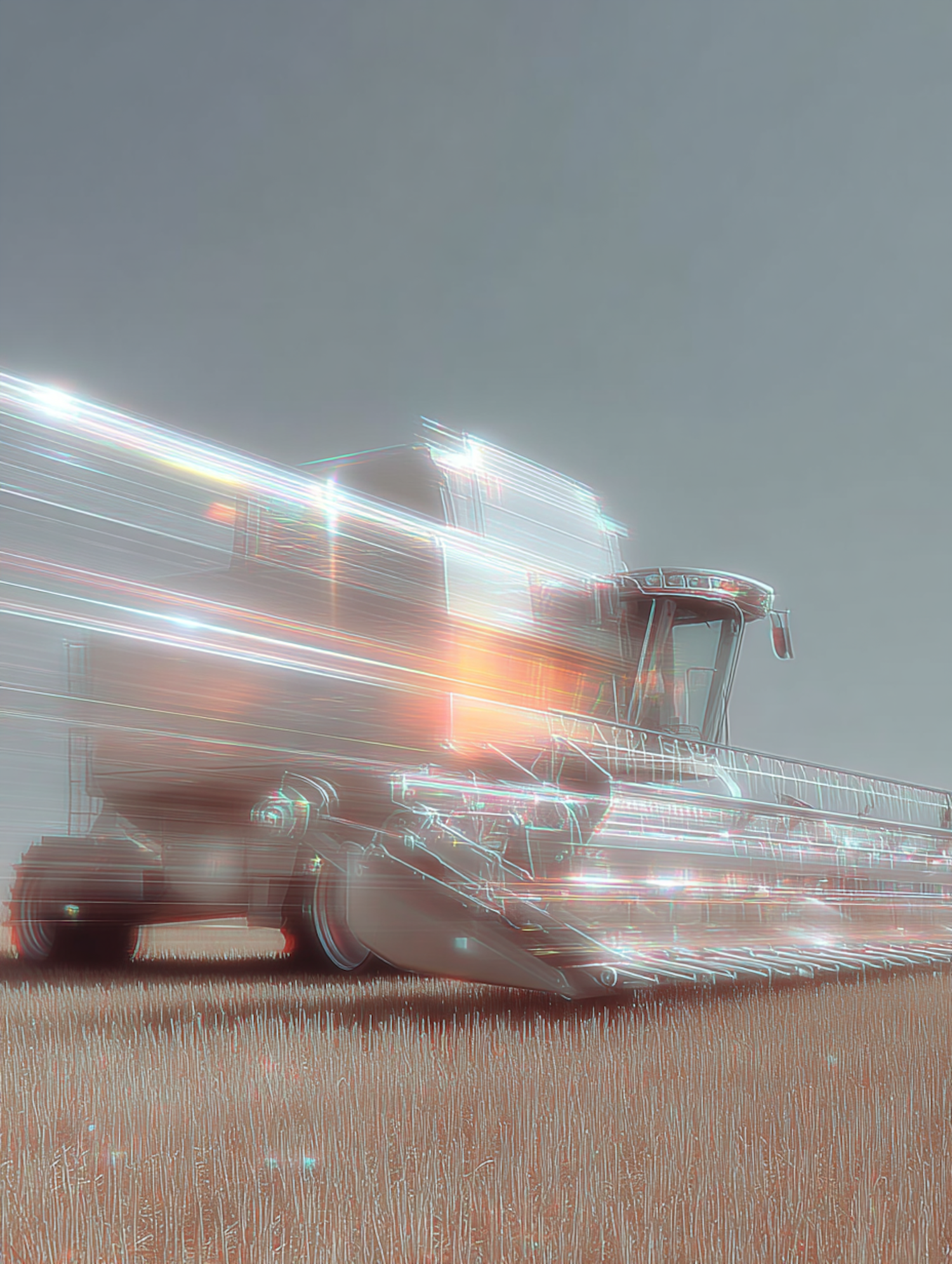 A futuristic combine harvester with glowing light trails in a field, showcasing advanced agricultural technology.