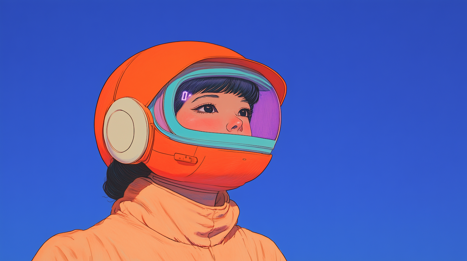 Futuristic illustration of a young woman in an orange space helmet against a deep blue sky, evoking exploration and wonder.