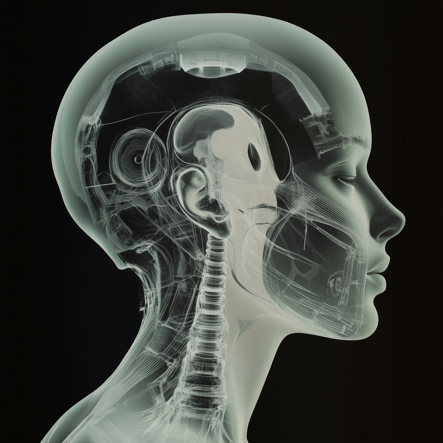 A futuristic profile of a human head blending anatomy and robotics, with transparent layers revealing mechanical and biological details.