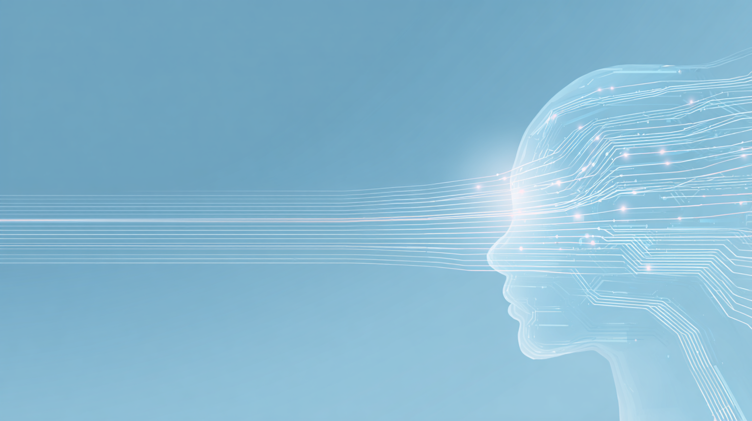 Futuristic digital illustration of a human profile with glowing circuits and lines, symbolizing technology and connectivity on a blue background.