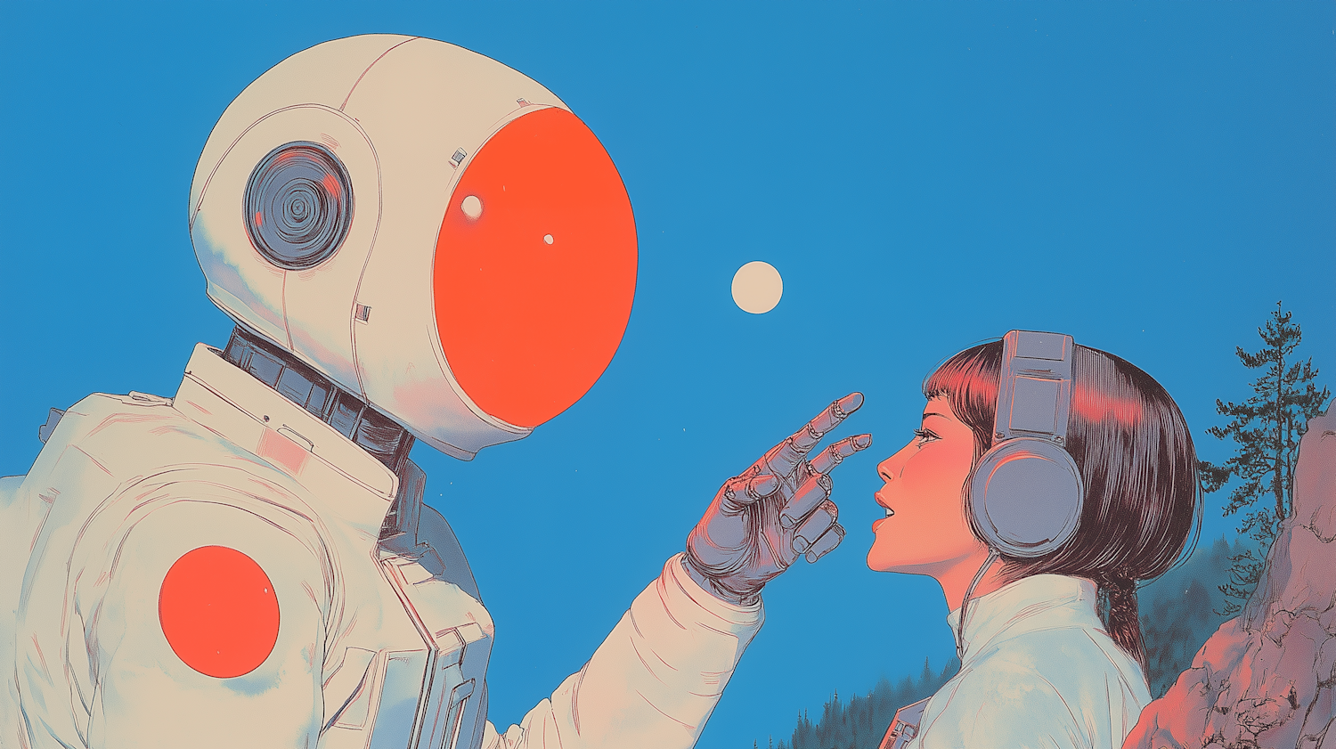A humanoid robot and a woman share a moment under a clear blue sky, highlighting futuristic interaction and vivid colors.