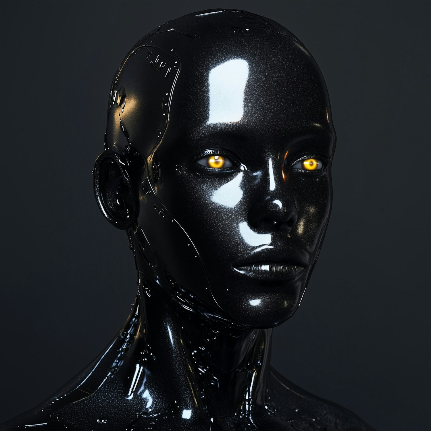 Sleek black humanoid robot with glowing yellow eyes, polished metallic surface, and futuristic design against a dark background.
