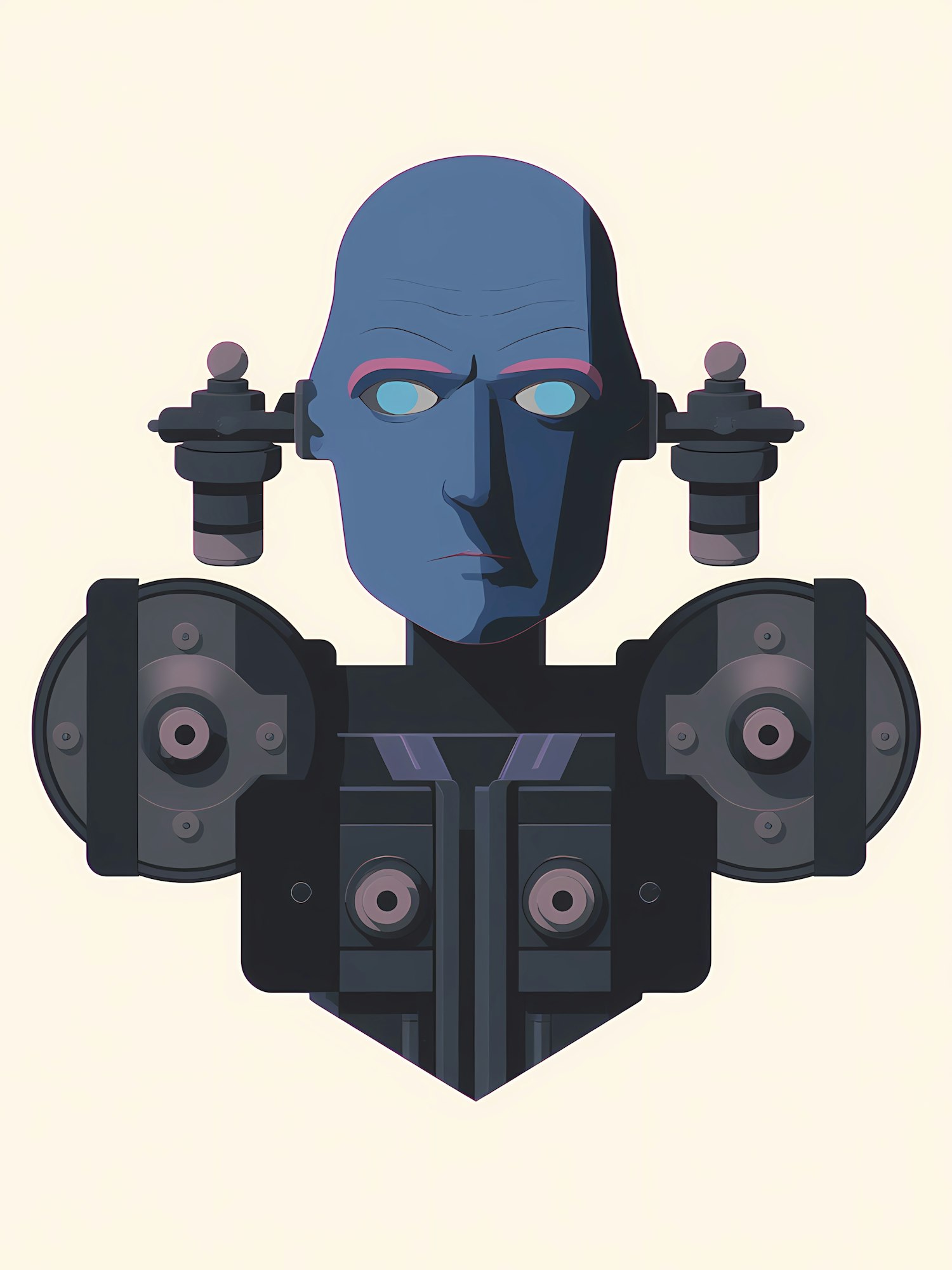 A futuristic illustration of a humanoid figure with a blue face and mechanical features, blending human and robotic elements.